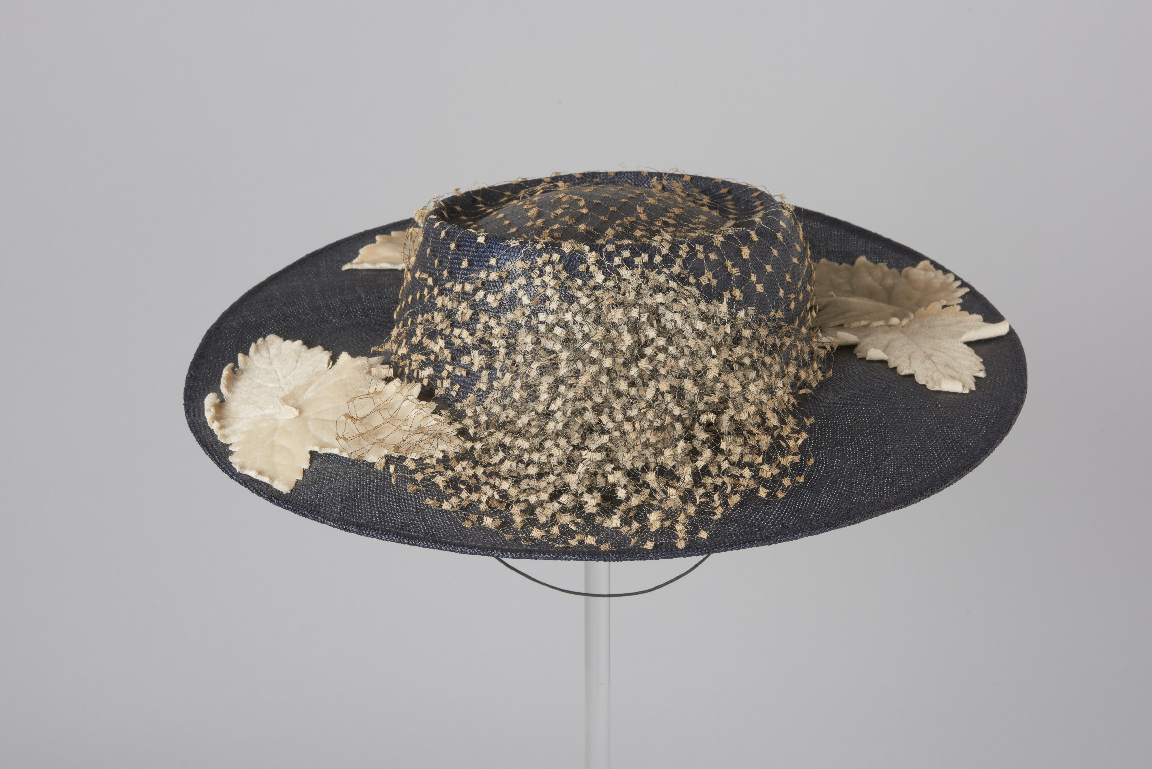 Hoed van donkerblauw gevlochten materiaal, met een brede rand. De bol van de hoed heeft een deuk. Daaroverheen ligt een grove hoeden'voile'. Op de rand van de hoed zijn appliques in vorm van bladeren van beige fluweel aangebracht. De hoed is onderdeel van een trouwensemble.