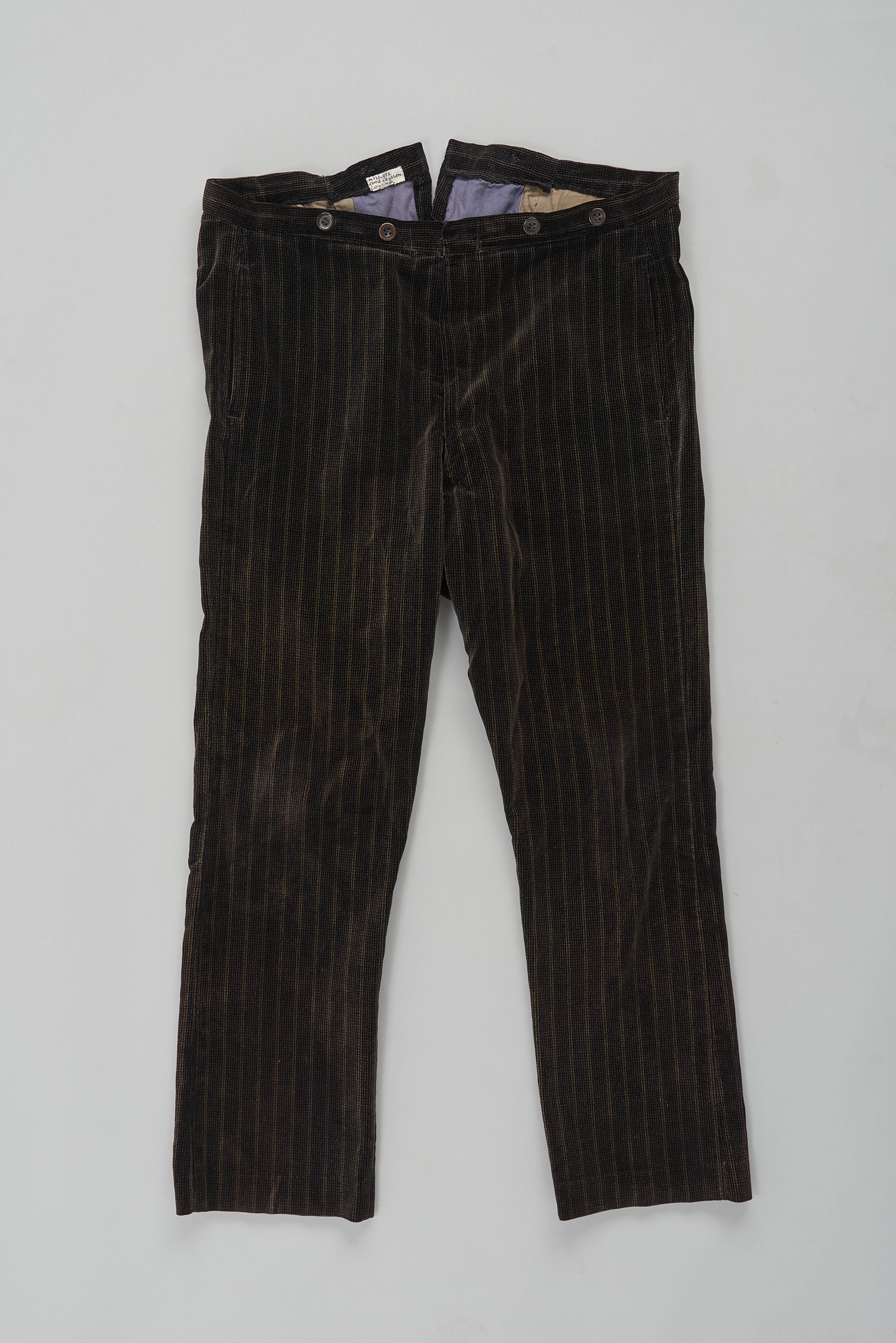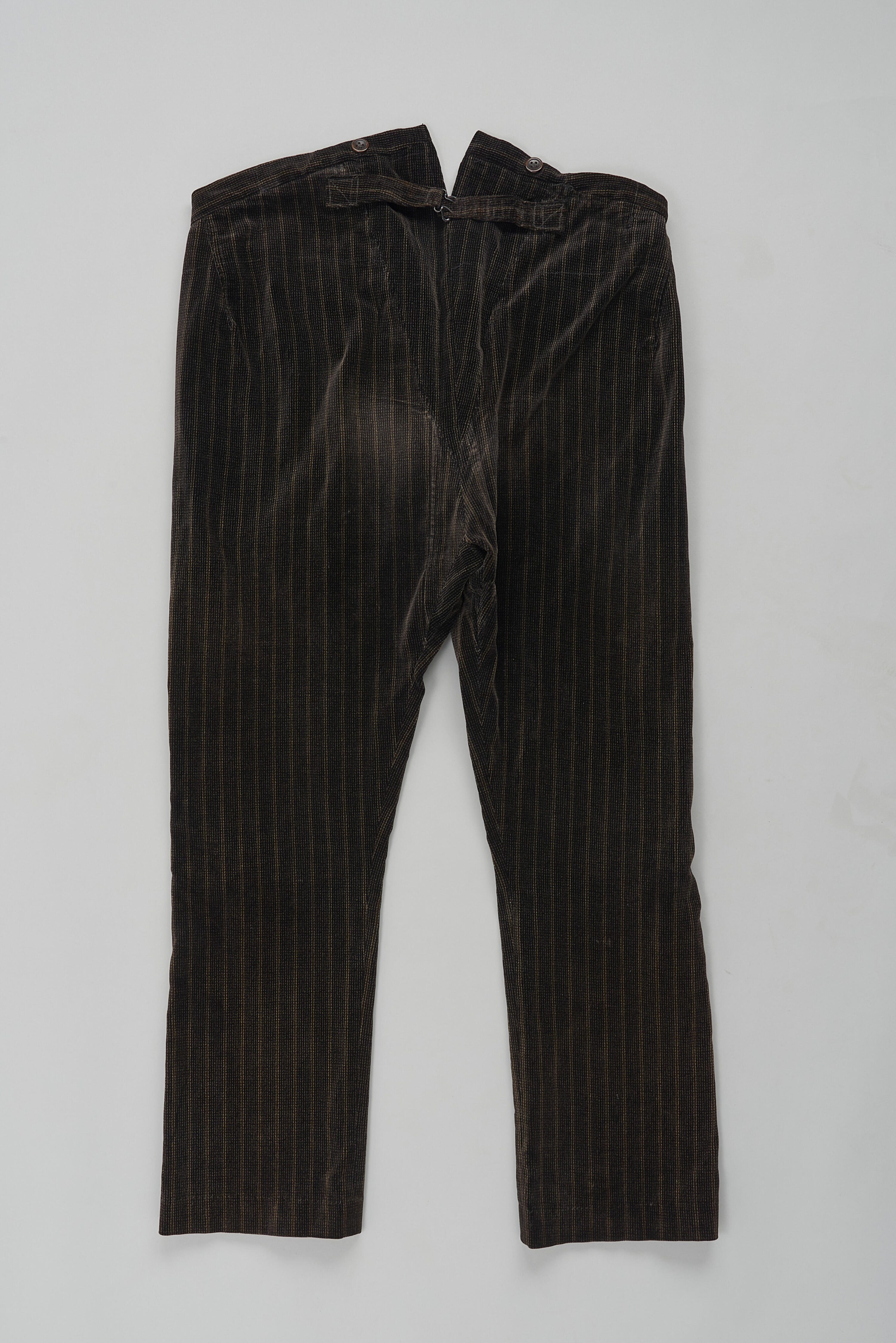 Lange broek van bruin/beige fluweel, afkomstig uit de buurtschap Zuna, bij Rijssen. Het verticale streepje is op de stof gedrukt. De broek lijkt nauwelijks gebruikt, maar is wel aan de achterzijde vermaakt. Er is middenachter een stuk ingezet. De broek heeft benen knopen aan de gulp en benen bretelknopen.