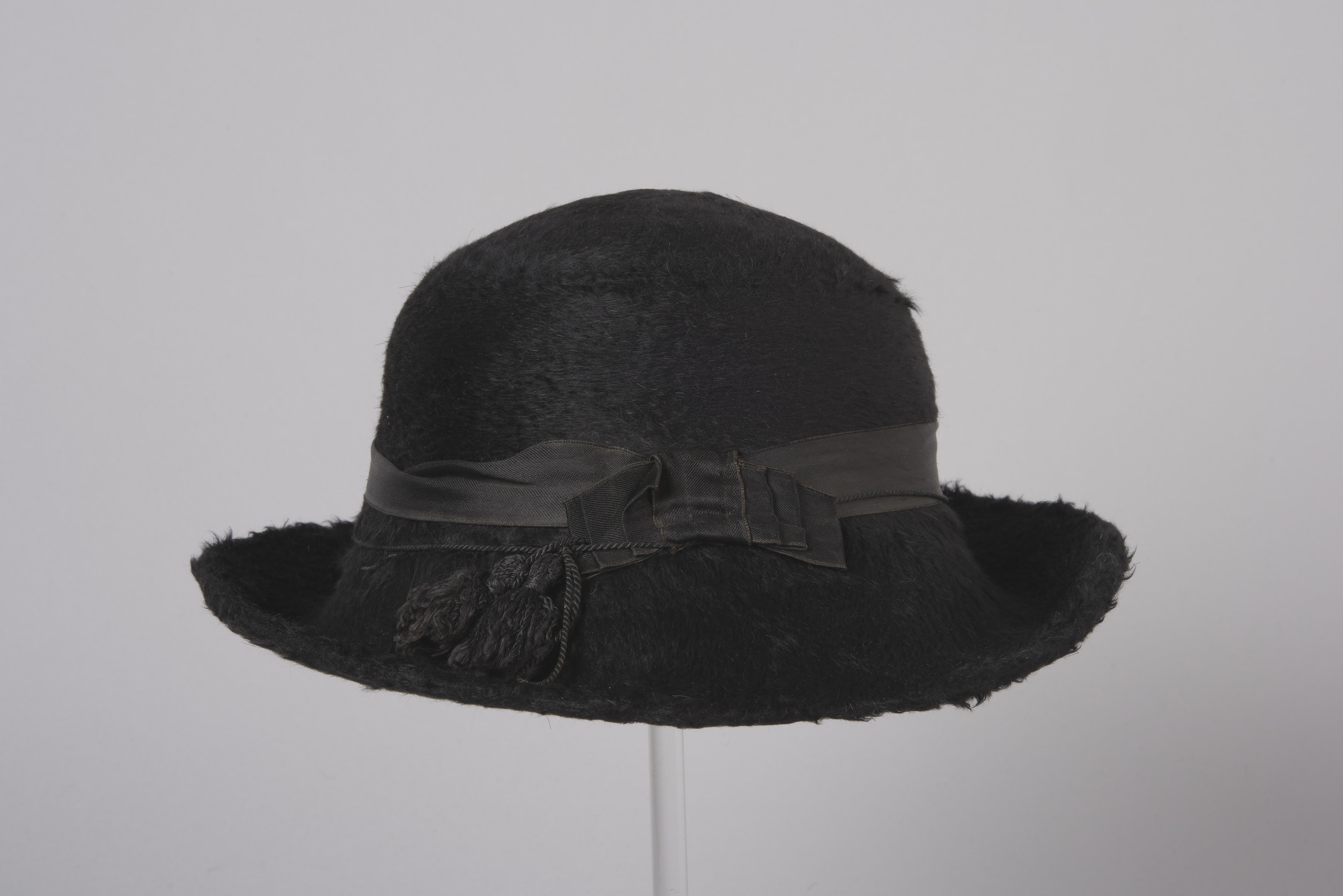 Zogenaamde 'pluus'oed', zoals die werd gedragen door mannen op Zuid-Beveland. Een echte 'pluus'oed' is gemaakt van hazenhaar en heeft een wat ruiger uiterlijk. Later komen steeds meer hoeden van vilt voor. Om de bol van de hoed zit een zwart koord met kwastjes. Katholieke mannen droegen de rand van hun pluchen hoed aan de voorkant ...