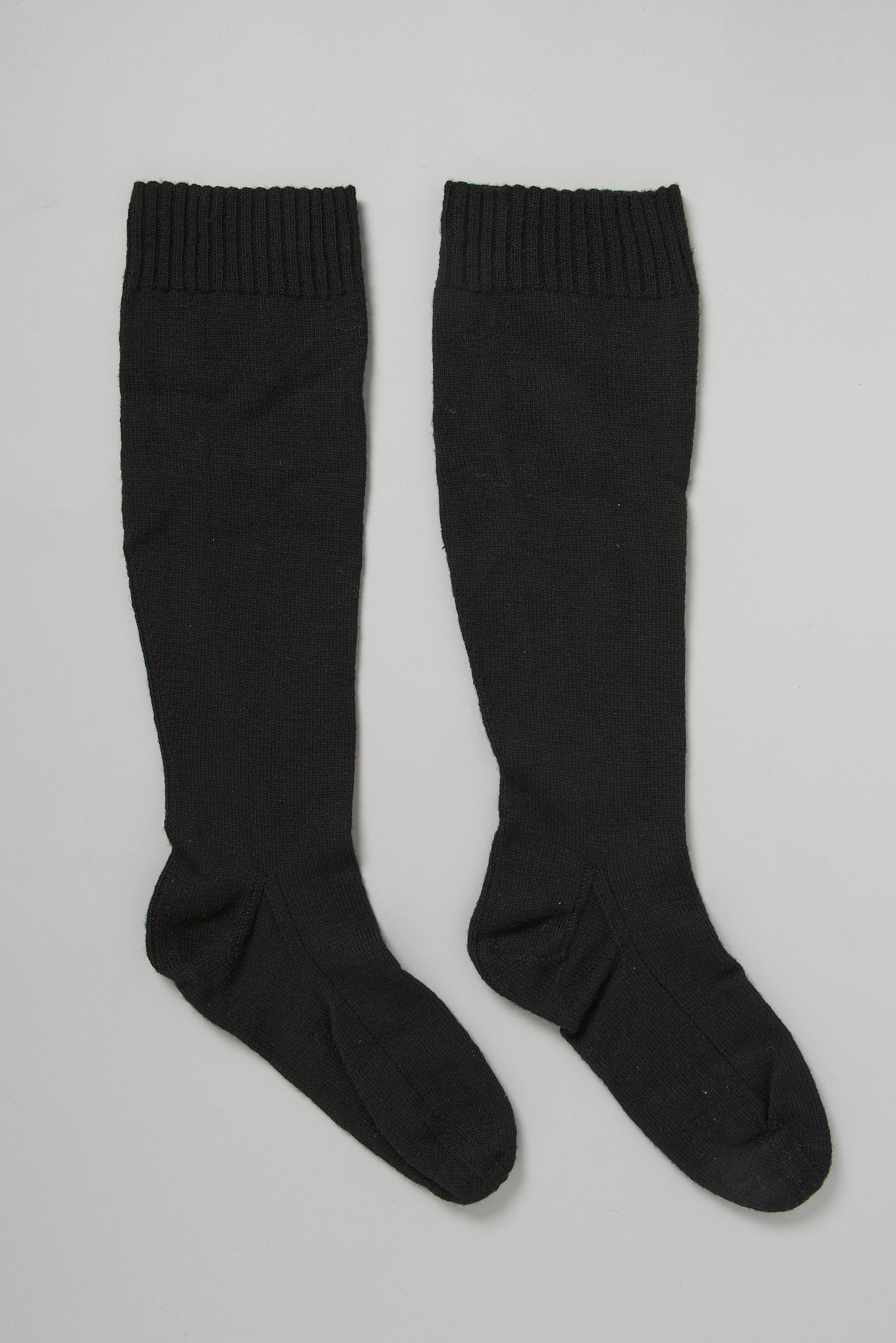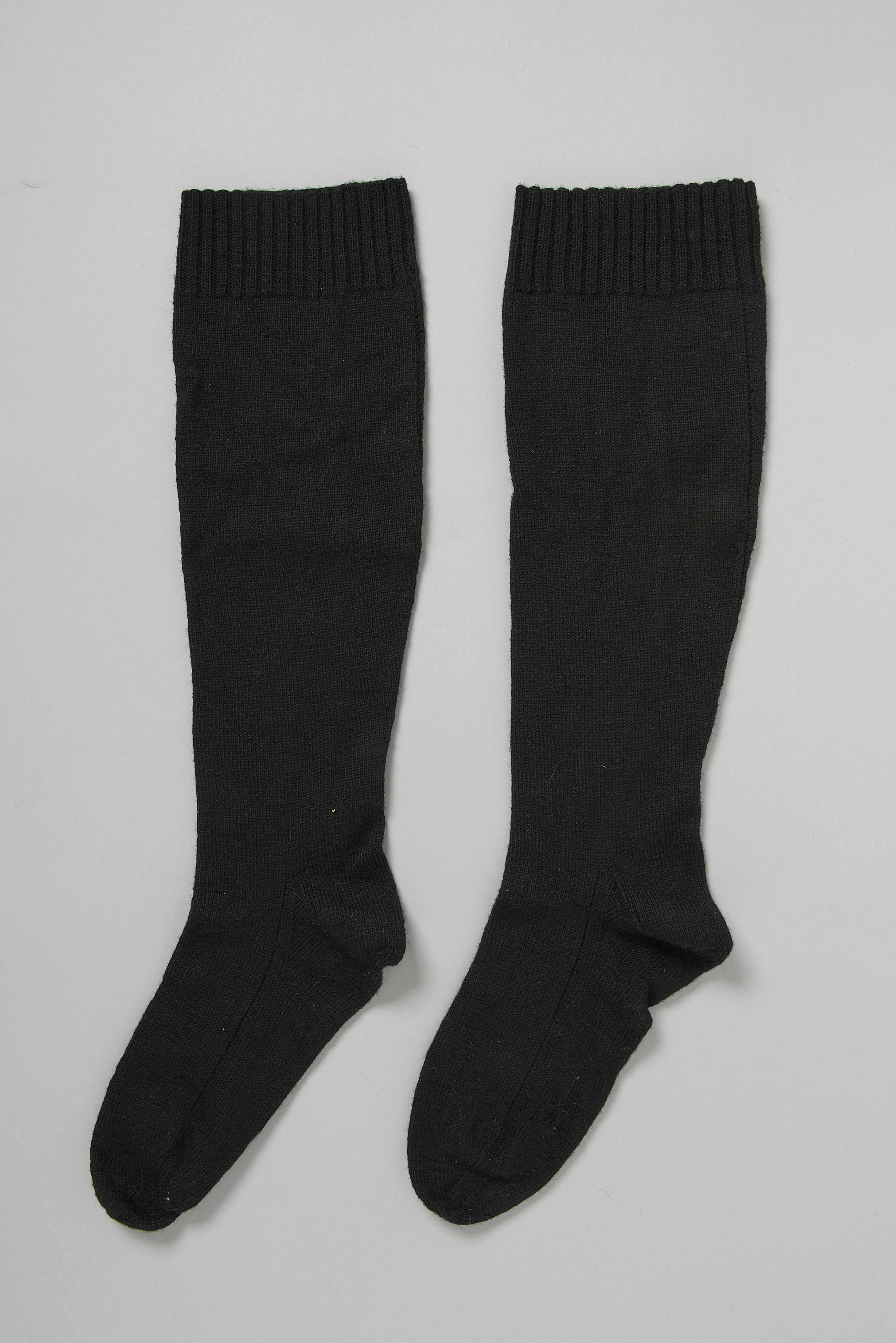 Een paar zwarte wollen kousen, gedragen door een vrouw in streekdracht uit Drenthe. De kousen zijn rondgebreid in rechte steken. Ze hebben aan de bovenzijde een boord die gebreid is in boordsteek. De kousen hebben een lengte van circa 56 centimeter.