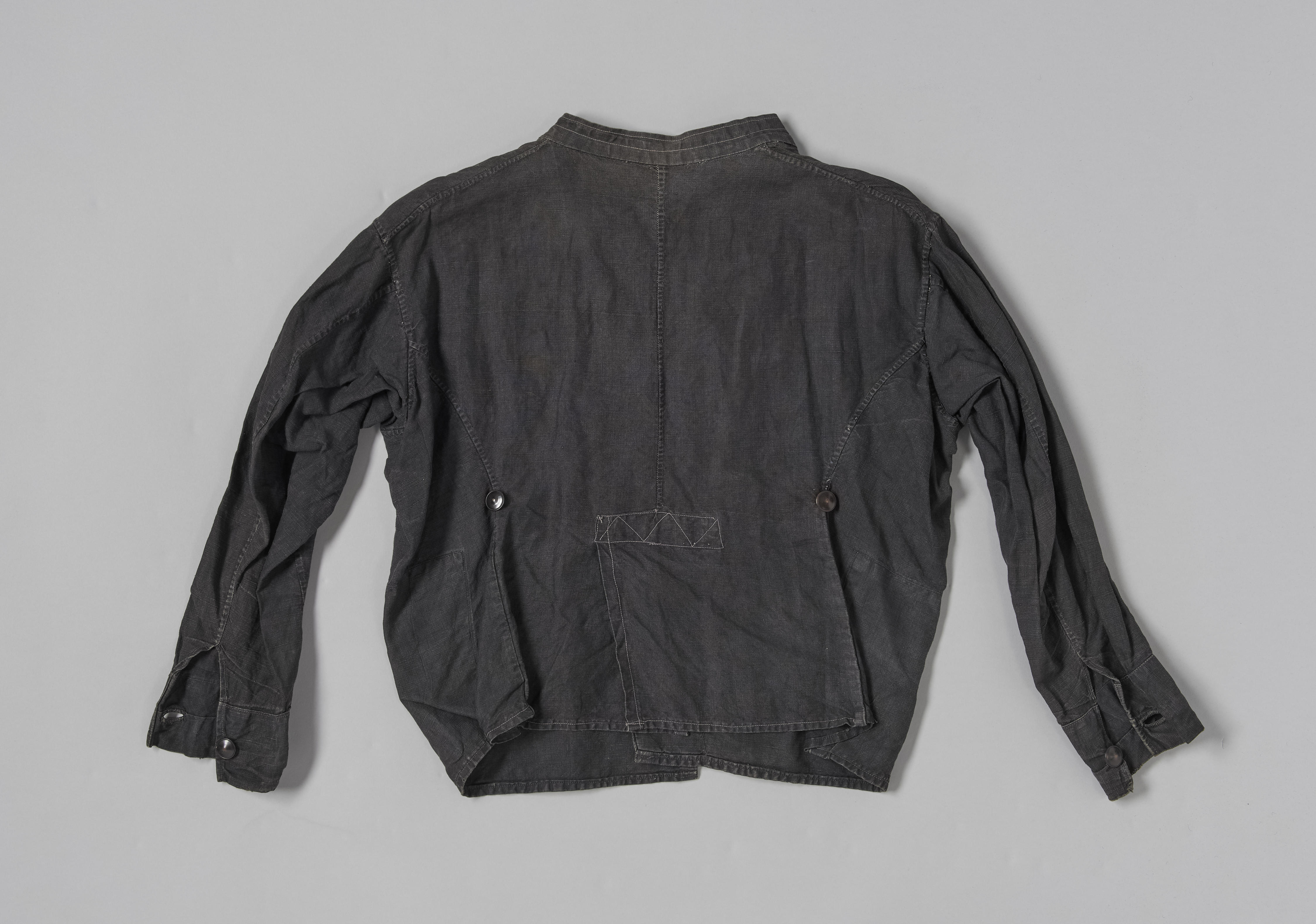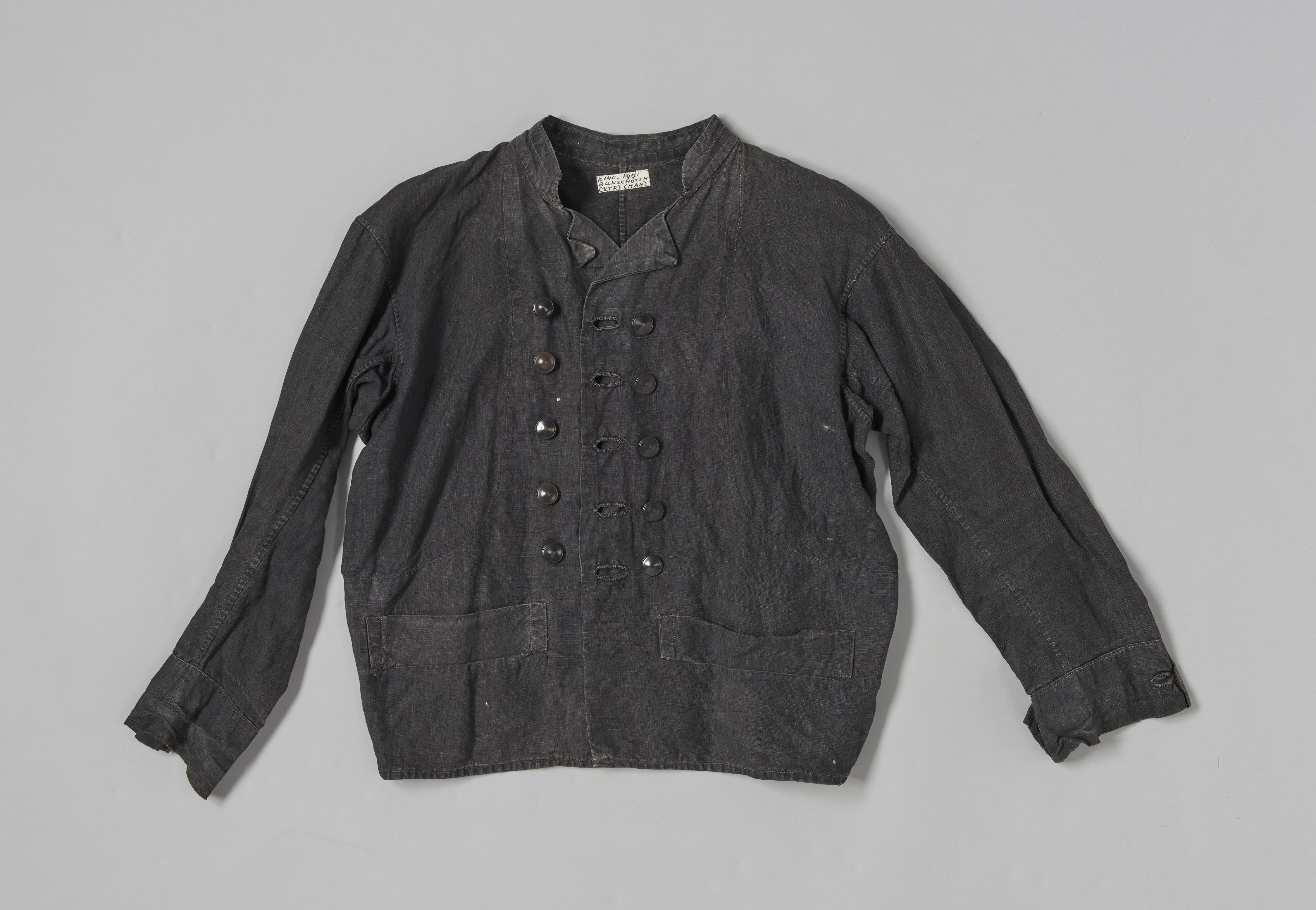 Linnen wambuis met benen knopen. Rond 1900 droegen de boeren in Bunschoten 's zomers als opknapdracht een linnen wambuis. Qua model leek het sterk op het wambuis van wollen laken. Alleen de zakken waren verschillend en het linnen wambuis werd niet gevoerd.