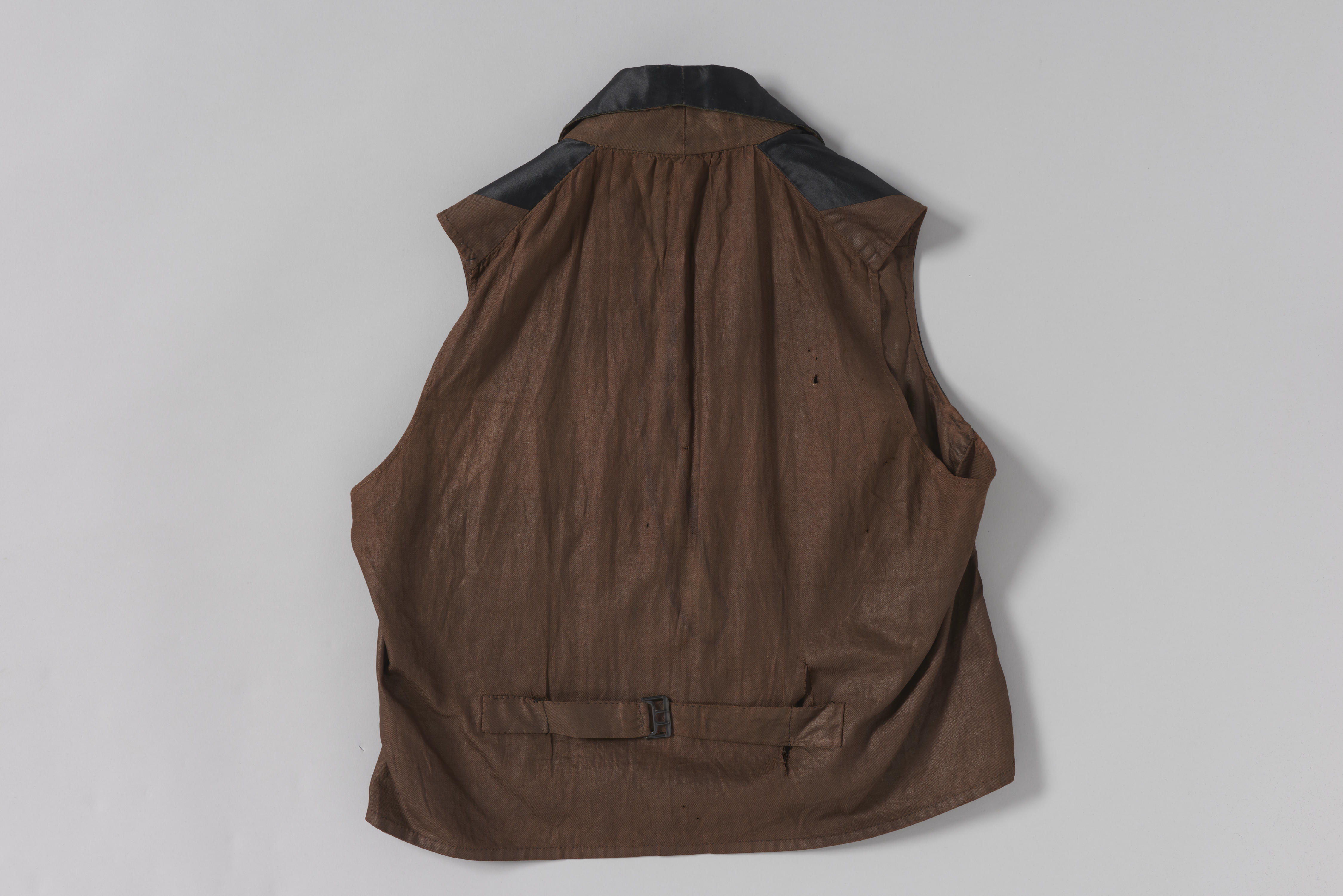 Vest met een zwart voorpand en een voering en achterpand van bruin, geglansd keperkatoen. Het vest is afkomstig van de Zuid-Hollandse eilanden.
