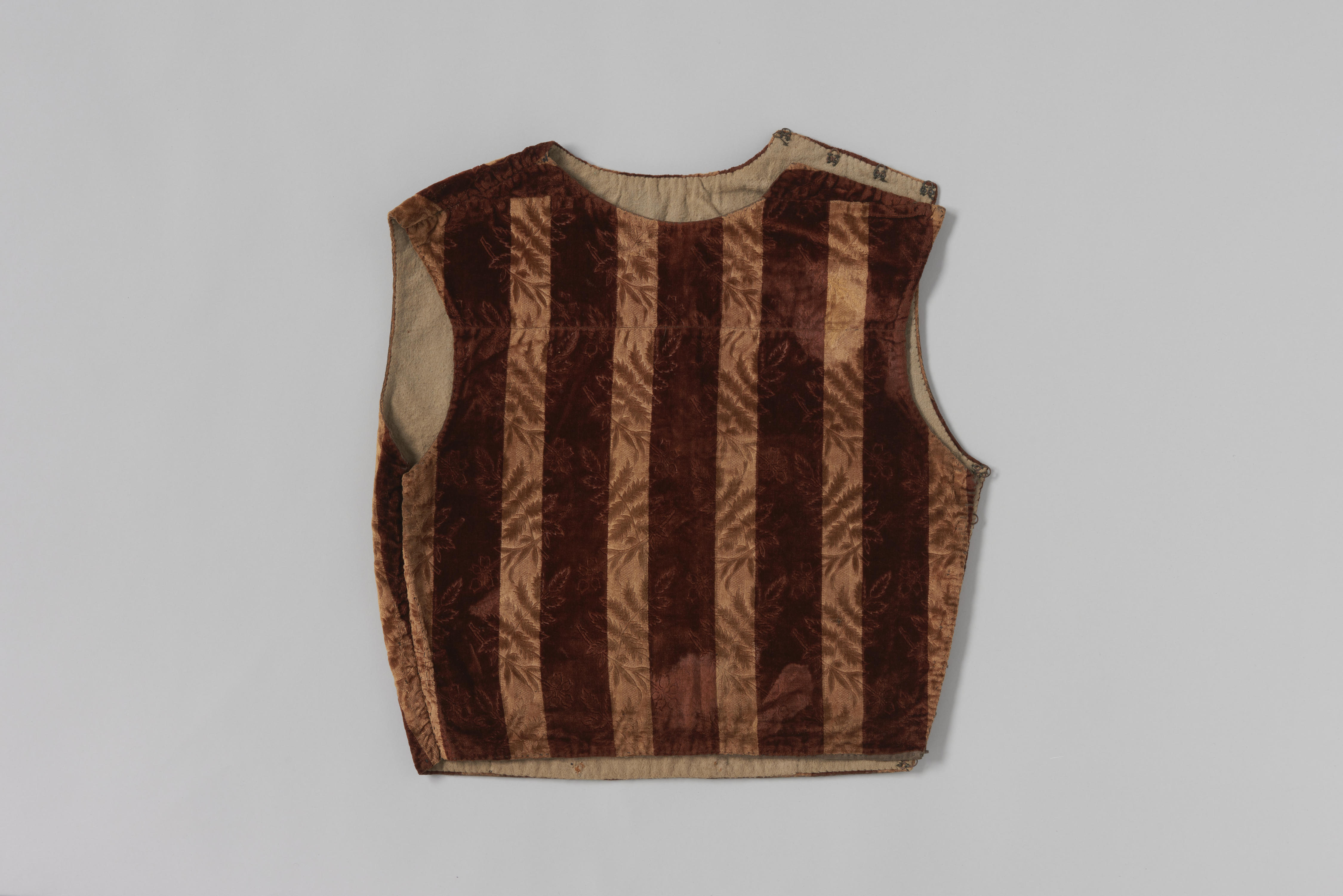 Kraplap van gestreept fluweel waarin een dessin van takjes is geperst. De kraplap heeft een voering van grijze, geruwde katoen en sluit aan één kant op de schouder en opzij met haken en ogen.