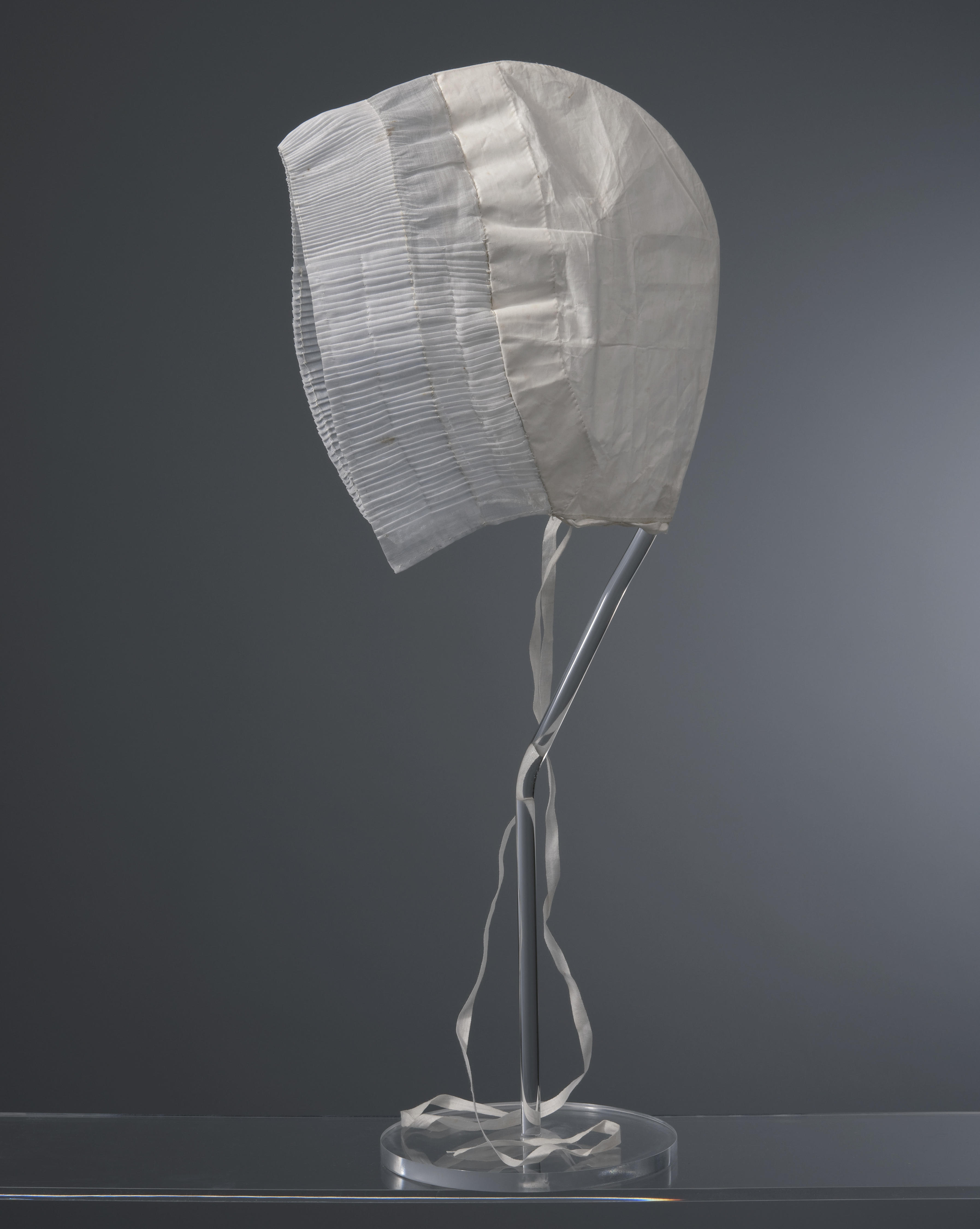 Handgenaaide rouwmuts met een bol van ongebleekte katoen en een geblauwde batisten voorstrook. De muts is afkomstig uit de Noord-Veluwe.