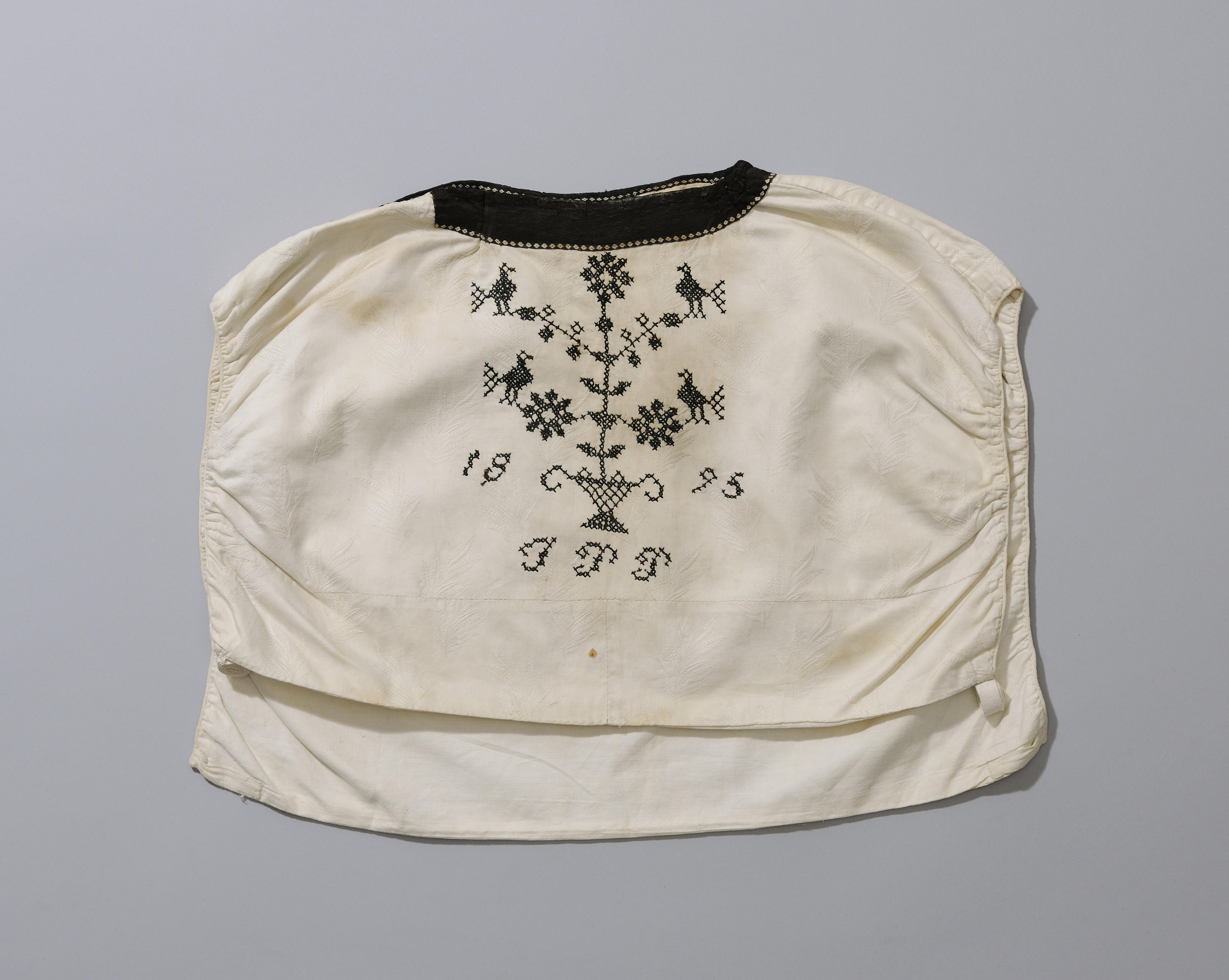 Zondagse en gelegenheidskraplap, afkomstig van Urk. Voor de zondag en voor speciale gelegenheden droegen de Urker vrouwen aan het einde van de negentiende eeuw een witte kraplap met in zwart geborduurde motieven. Deze waren aanvankelijk groot en werden in de loop van de twintigste eeuw steeds kleiner. De (buitenste) letters ‘JT’ zijn de initialen van ...