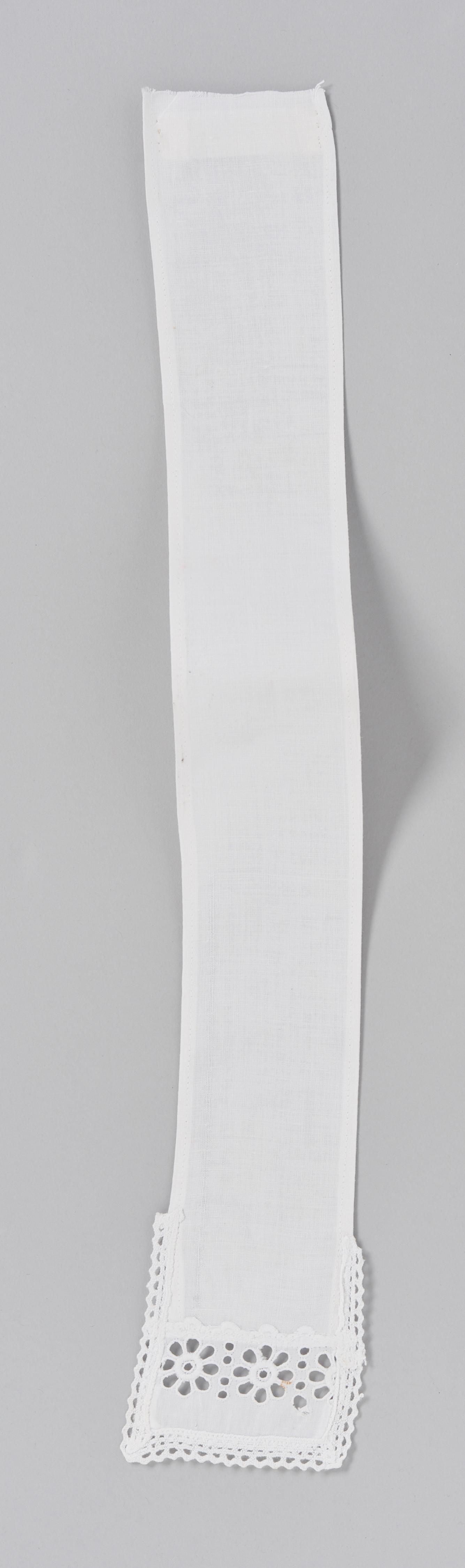 Losse keelband of kinband. De kinband hoorde bij een muts die gedragen is in de veenkolonie in Drenthe door veenarbeiders uit vermoedelijk Overijssel of Gelderland.
