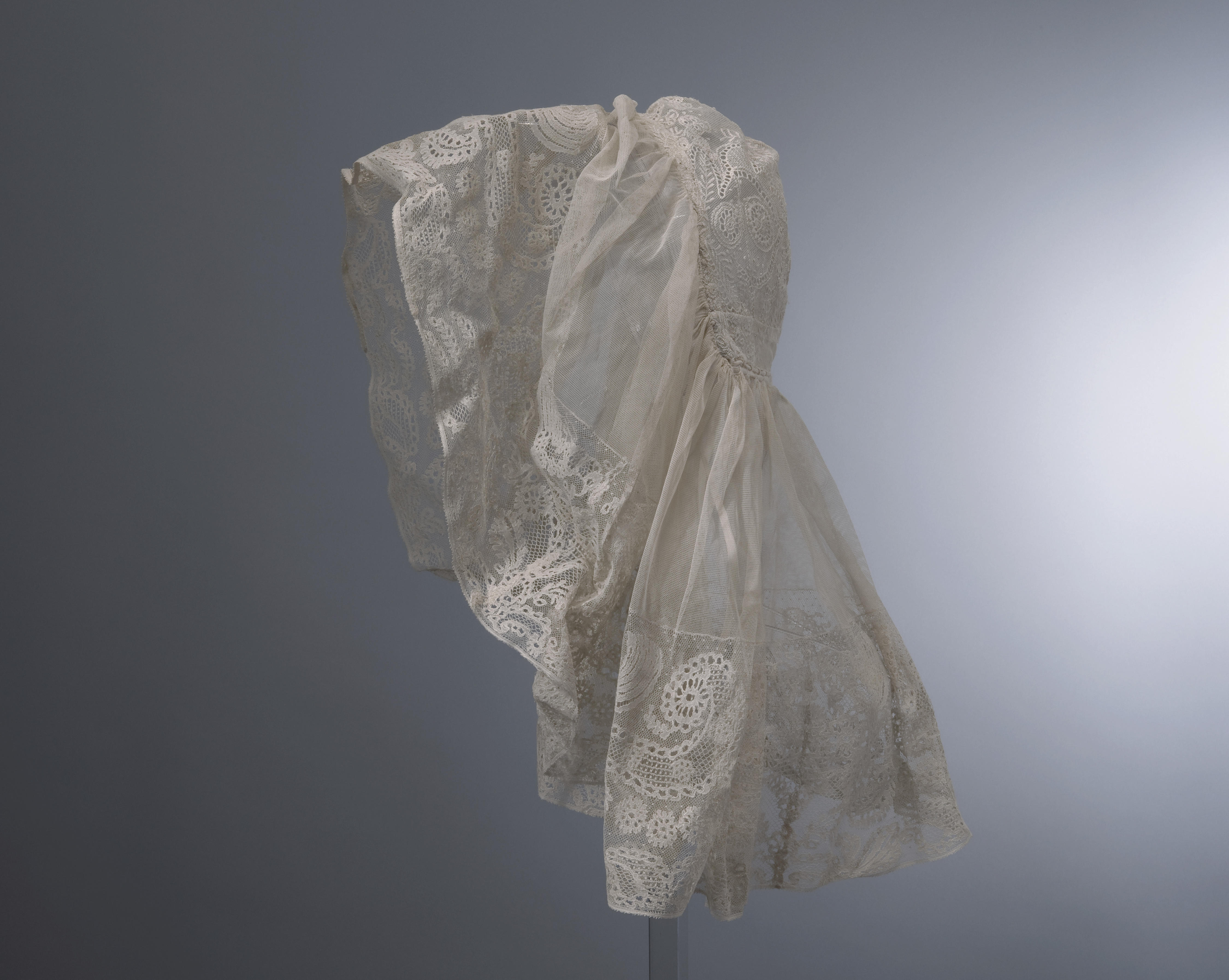 Sluiermuts met een bol van doorgestopte tule en een tulen strook met een 14 centimeter brede kant met een motief van hanen. De muts is niet opgemaakt en het laitondraad, dat de voorkant van de muts verstevigt, ontbreekt.