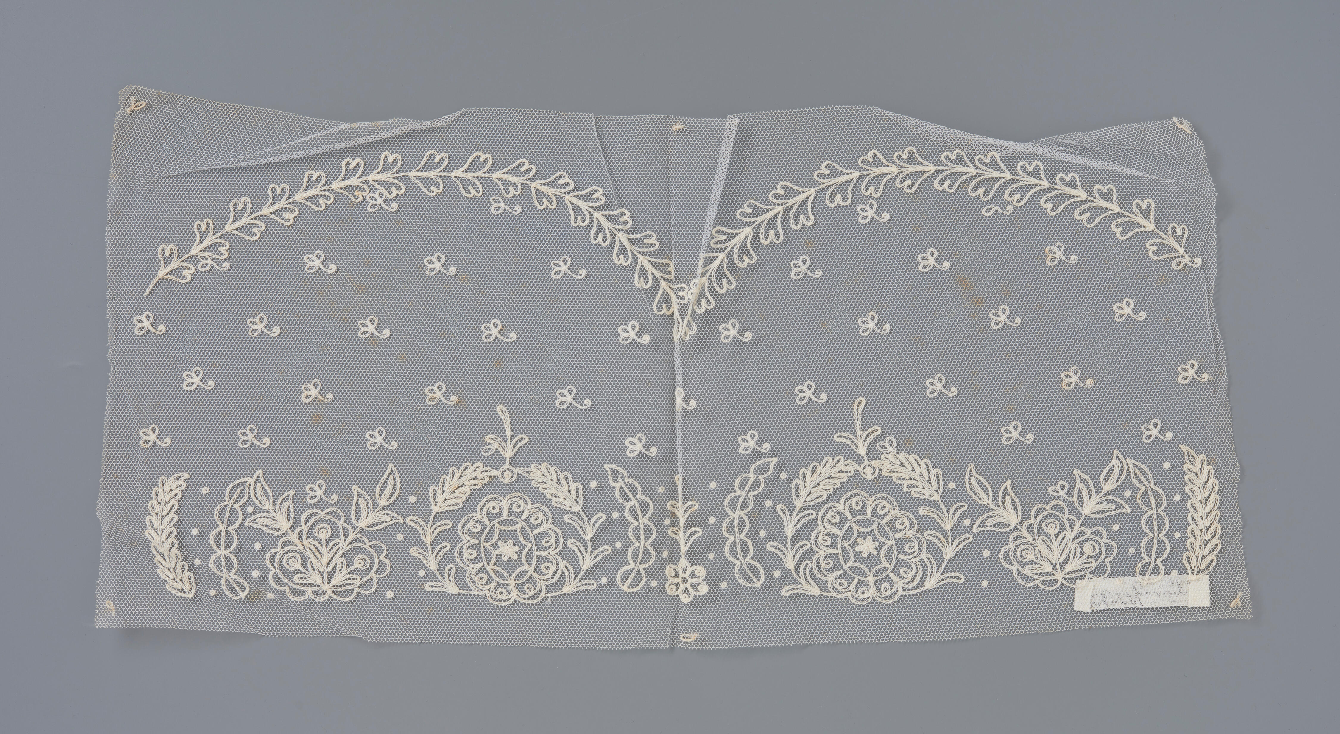 Een rechthoekige lap machinale tule. Op de tule is op patroon geborduurd met katoen in kettingsteek. De lap was bedoeld voor de vervaardiging van een mutsenbol van een Zandvoortse hul.
