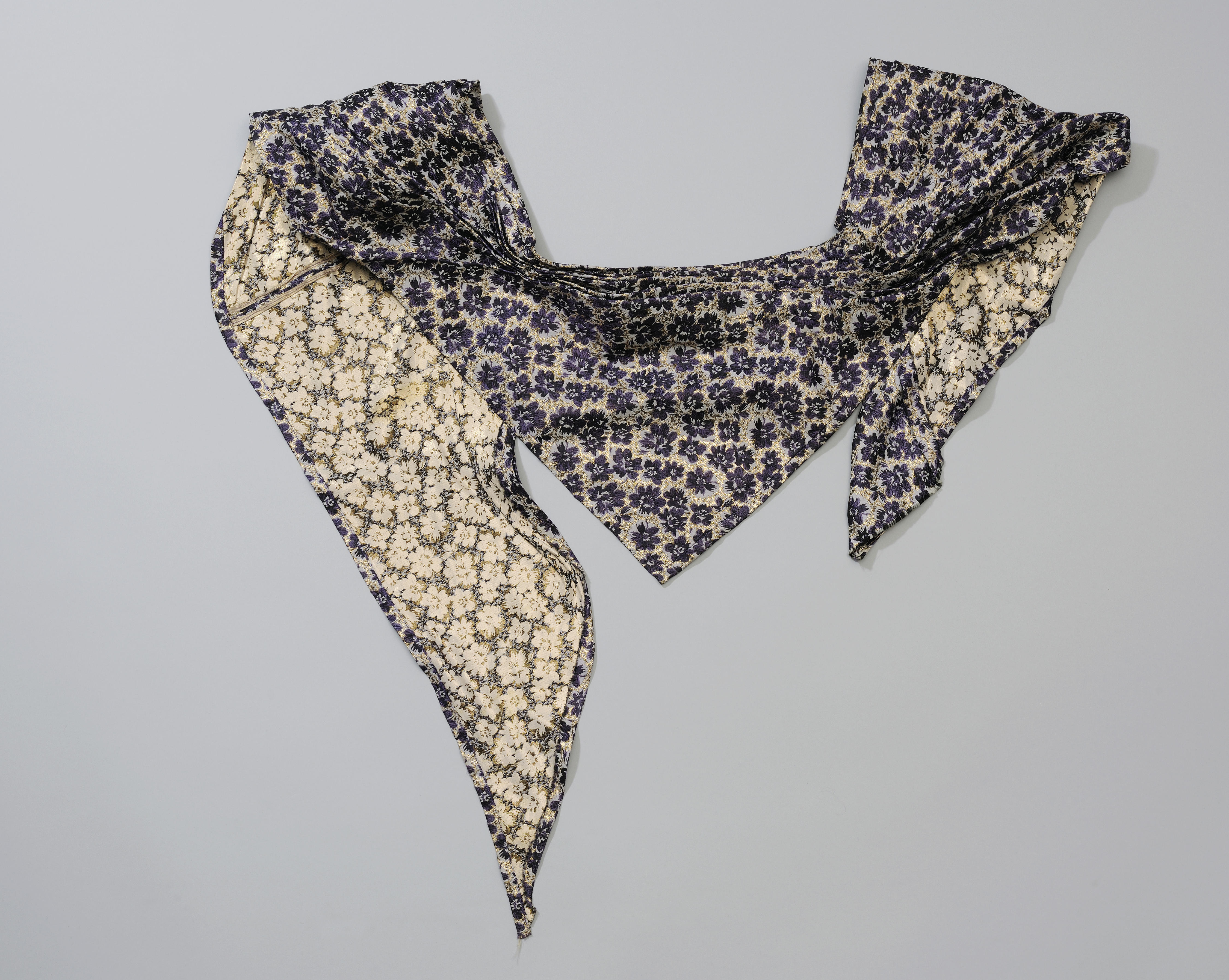 Opgemaakte schouderdoek, behorend bij een zondagse beuk van hetzelfde materiaal. In de plooi die het dichtst aan de hals ligt is een strook karton bevestigd ter versteviging. Zo blijft de doek op de rug mooi afstaan. De lange zijde van de doek is niet afgewerkt. Deze valt naar binnen bij het dragen.