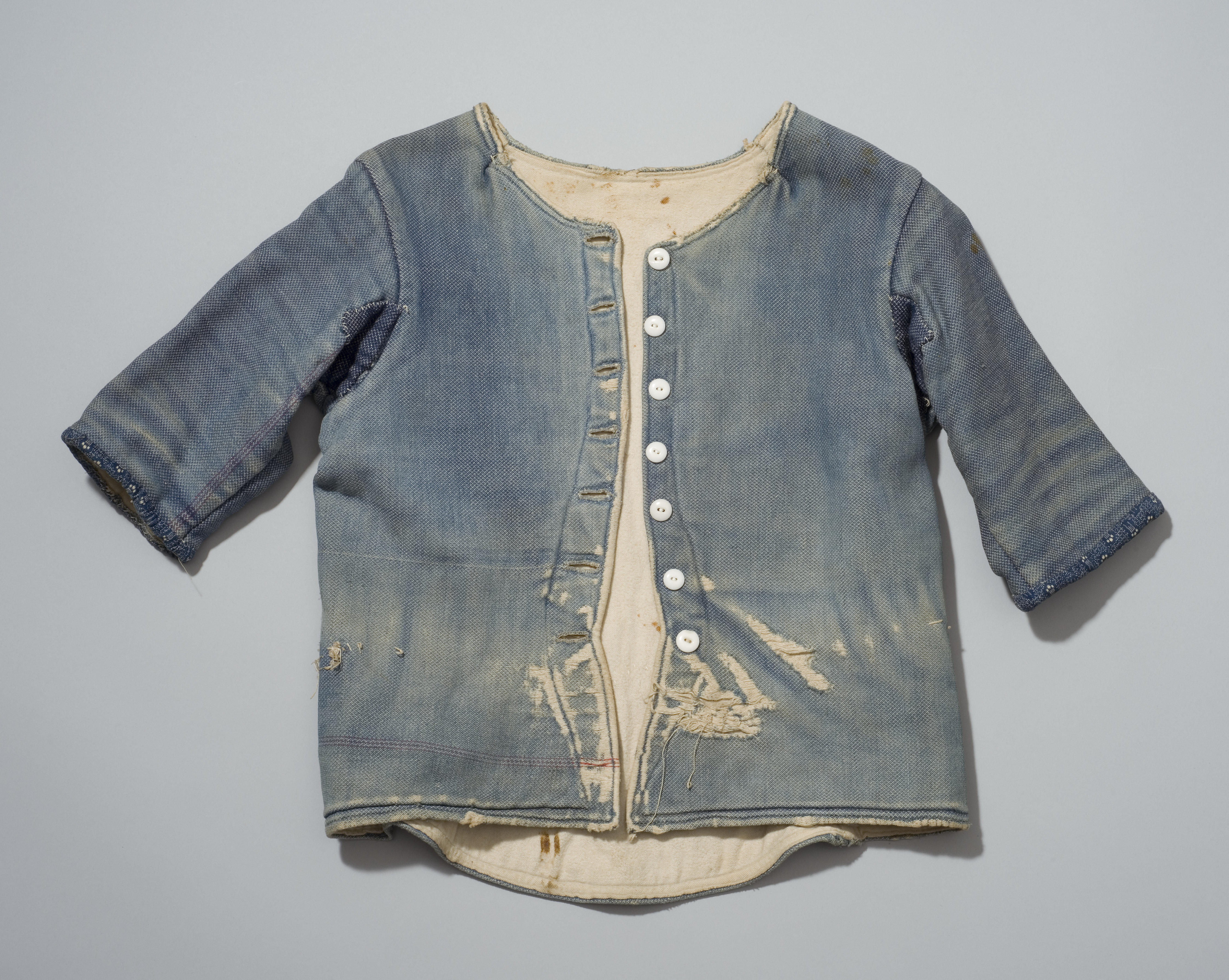Sterk versleten hemdrok van donkerblauwe katoenen 'oogjesgoed'. De hemdrok heeft een ronde hals, korte mouwen en een voering van witte molton. Hij is afkomstig uit de provincie Groningen.