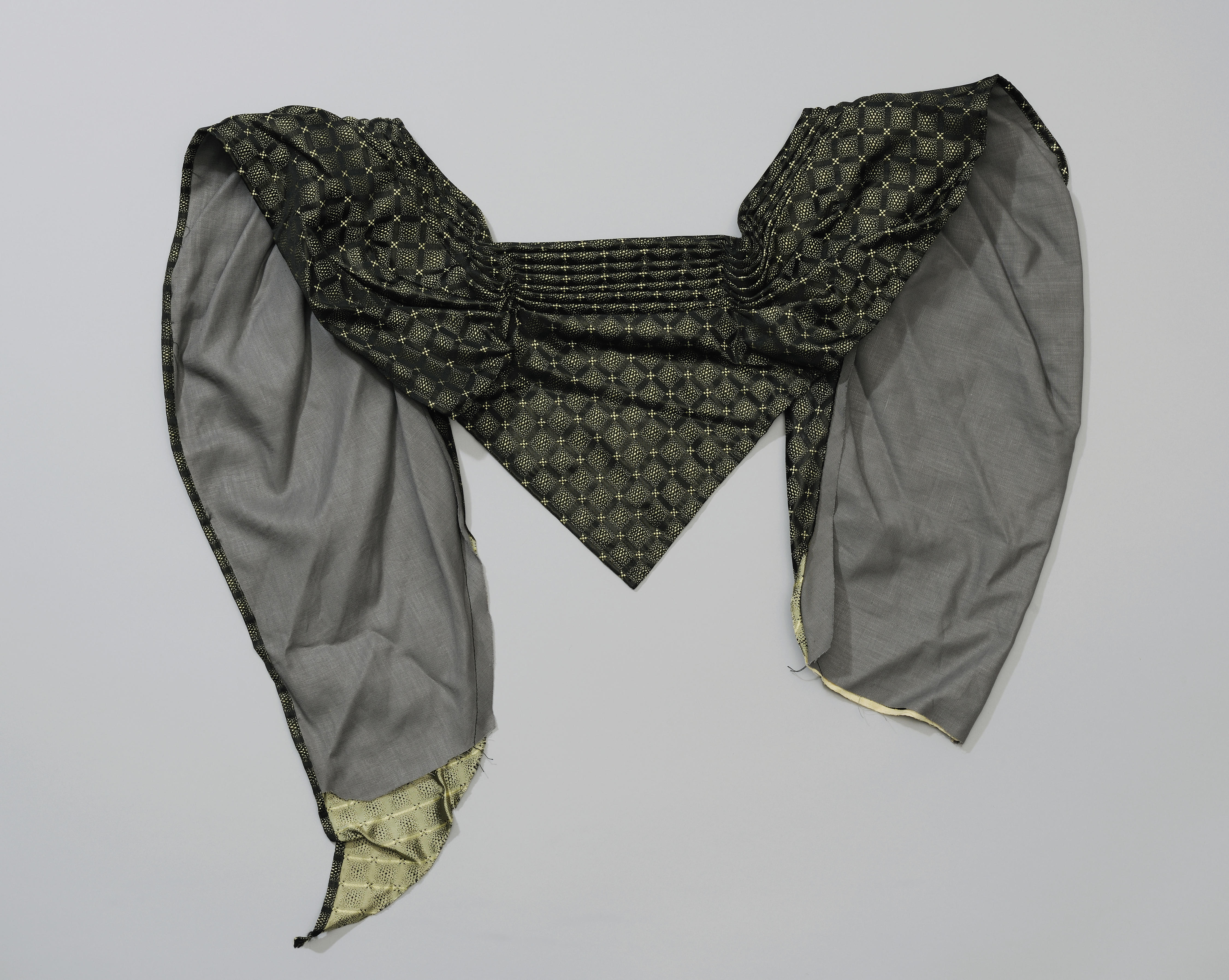 Doek van kunstvezel met katoenen voering, behorend bij een beuk. De doek is in vorm gevouwen, verstevigd met karton en met enkele steekjes vastgezet.