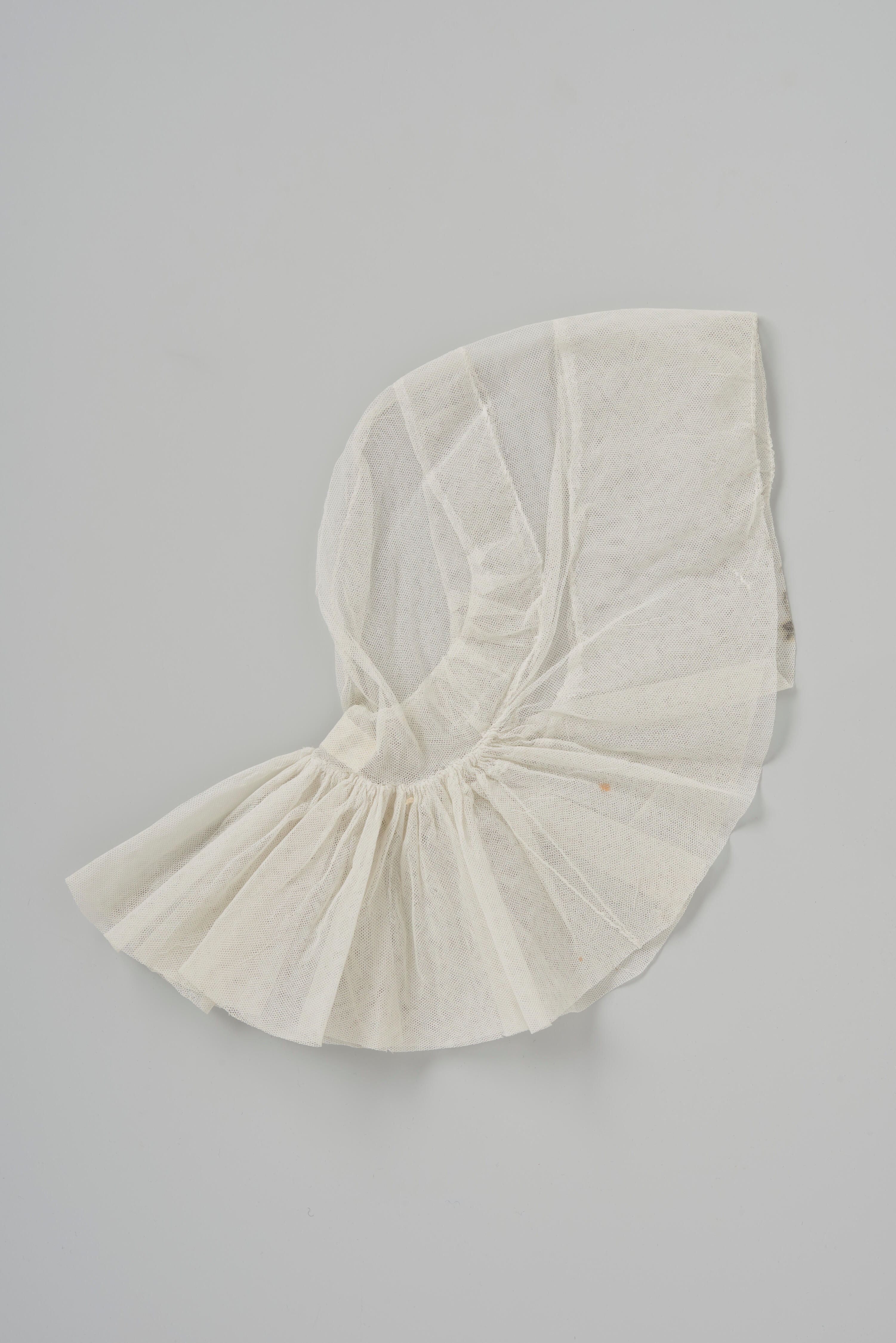 Tulen floddermuts, gedragen tijdens de lichte rouw door een vrouw in Groninger streekdracht. De floddermuts wordt gedragen over de witte ondermuts, de zwarte tussenmuts en het oorijzer. De muts is gemaakt van effen witte tule. De strook rond de bol is van dubbelgenomen stof. De rand van de bol is ook van dubbelgenomen stof. De ...