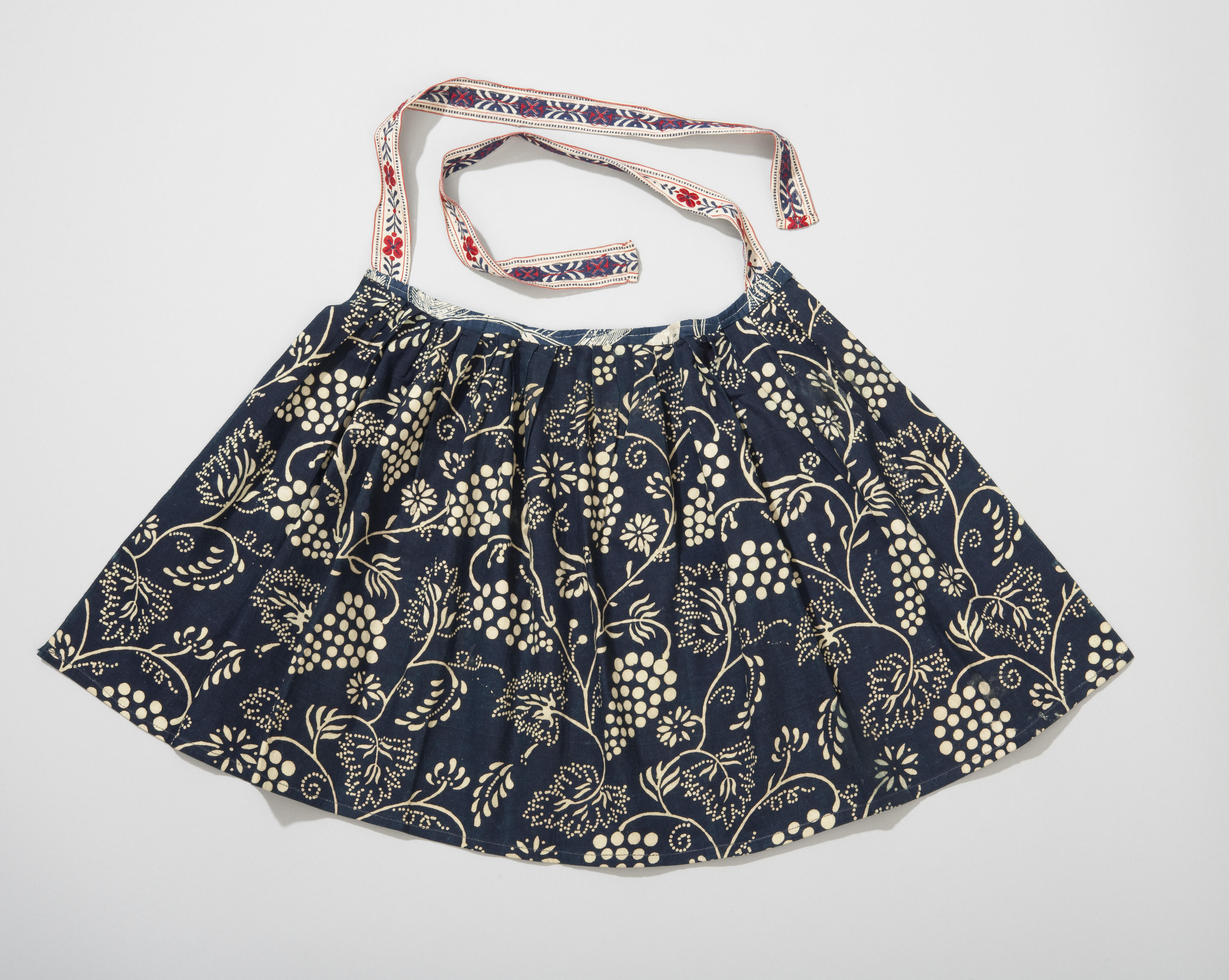 Katoenen druivenboezel of schort voor een jongen tot 5 jaar oud op Marken. Dergelijke boezels werden gedragen op zondag.