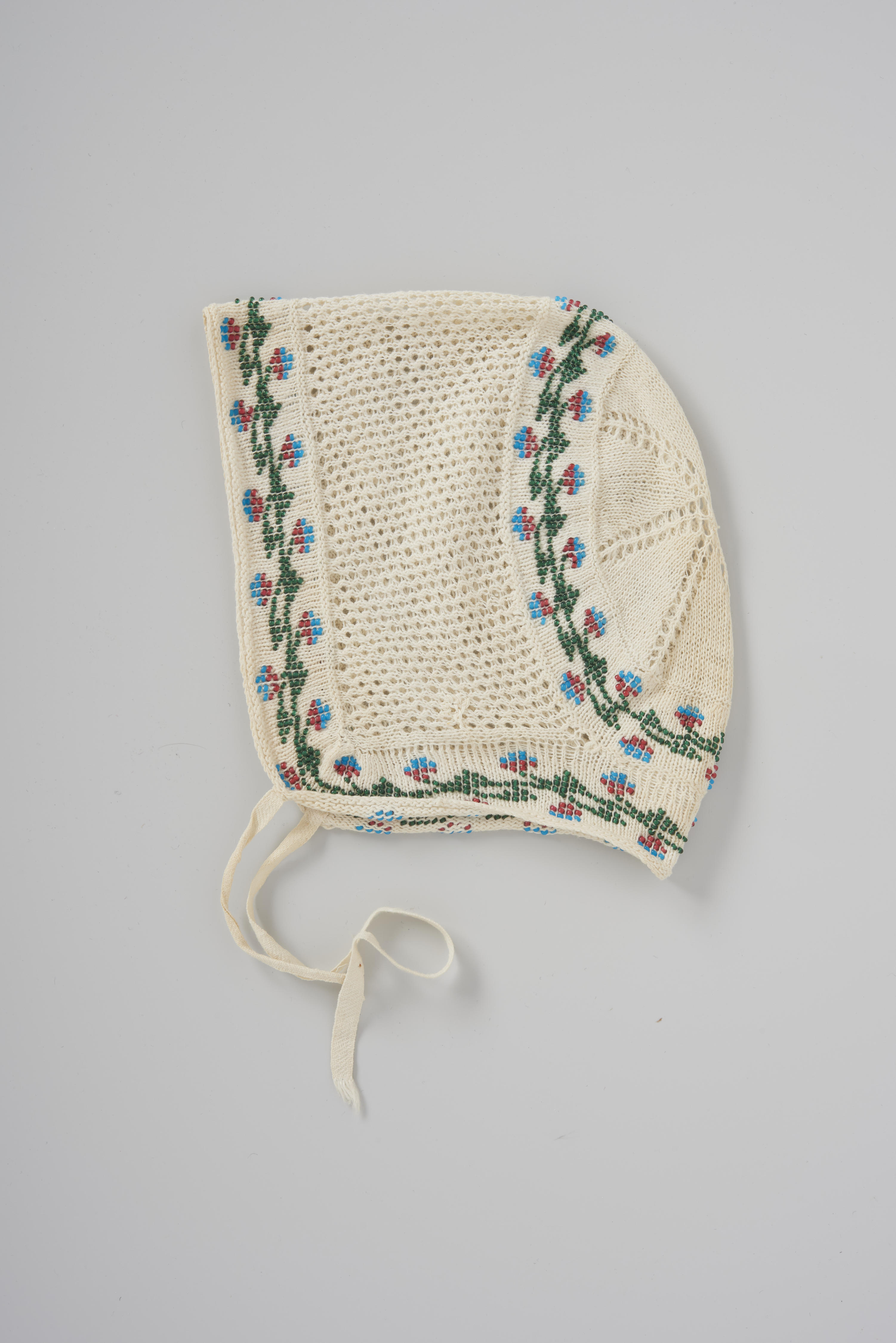 Gebreid babymutsje van katoen. In tegenstelling tot de meeste mutsjes met ingebreide kralen zijn in het bolletje van dit mutsje geen kraaltjes gebreid. Langs het bolletje loopt rondom een rand met ingebreide, veelkleurige bloemmotieven van kraaltjes. Dezelfde rand loopt langs de voorzijde en door in de nek. Het deel op het hoofd tussen deze randen ...