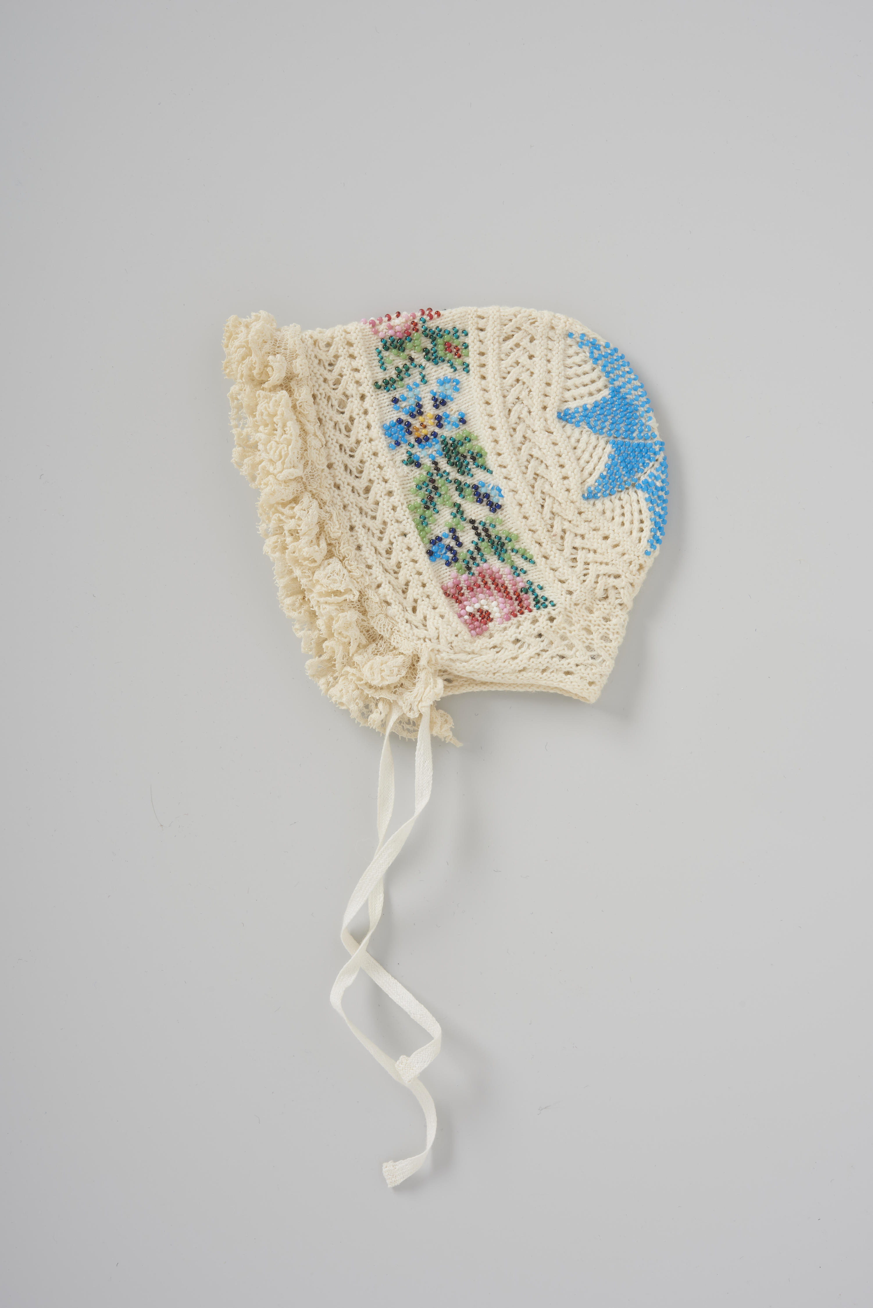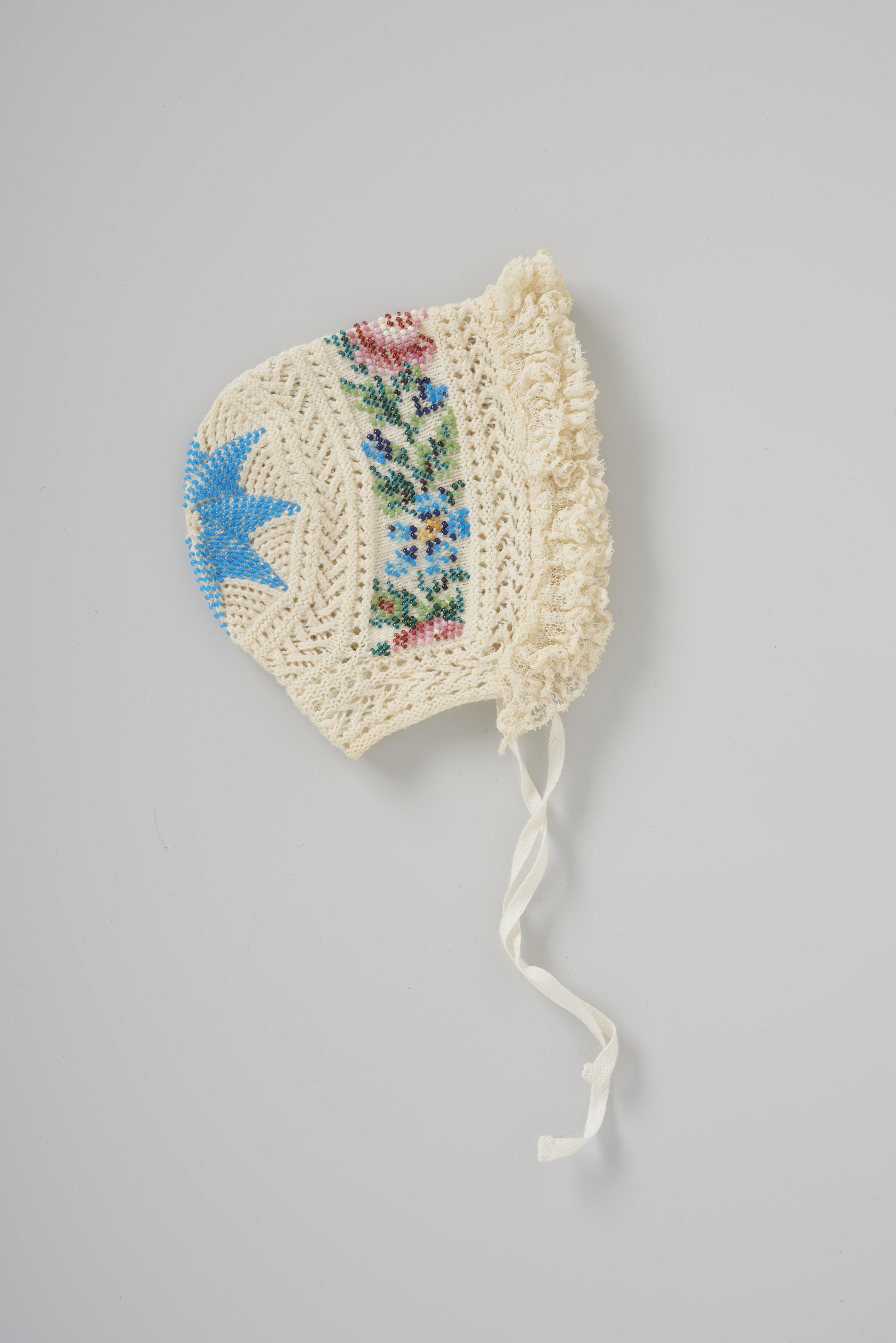 Ajour gebreid babymutsje in crèmekleurig katoen met ingebreide, veelkleurige kraaltjesmotieven. Het bolletje op het achterhoofd heeft de gebruikelijke stervorm in blauwe kraaltjes als motief. Over het hoofd zit een veelkleurig bloemenfries. Langs de voorzijde is het mutsje afgewerkt met een gefronsde rand van kant. Het mutsje heeft geweven kinbandjes. Het is afkomstig uit Noord-Holland.