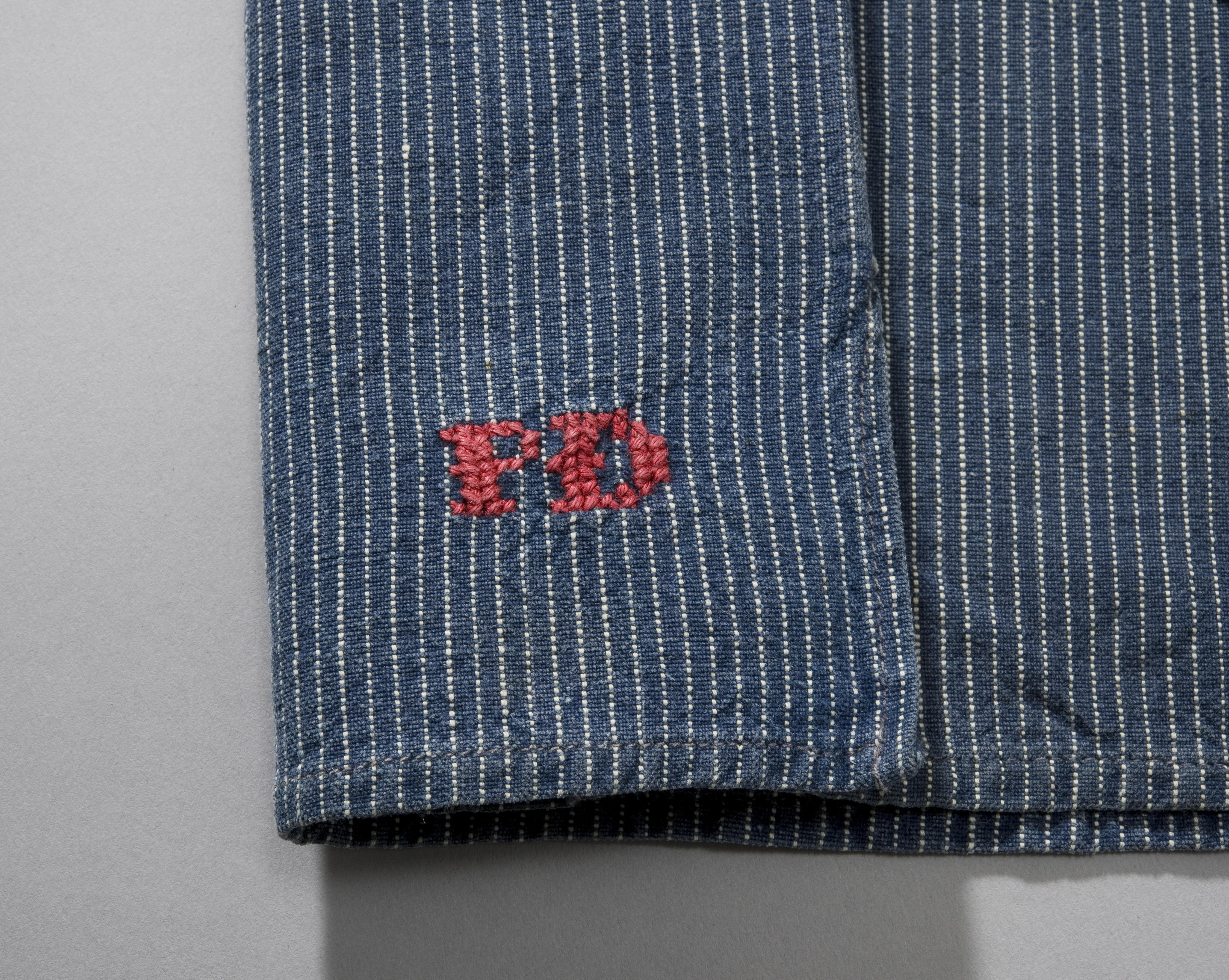 Jongensboezeroen van blauw gestreepte katoen met gefestonneerde knoopsgaten in rood garen. De boezeroen is afkomstig van Marken.