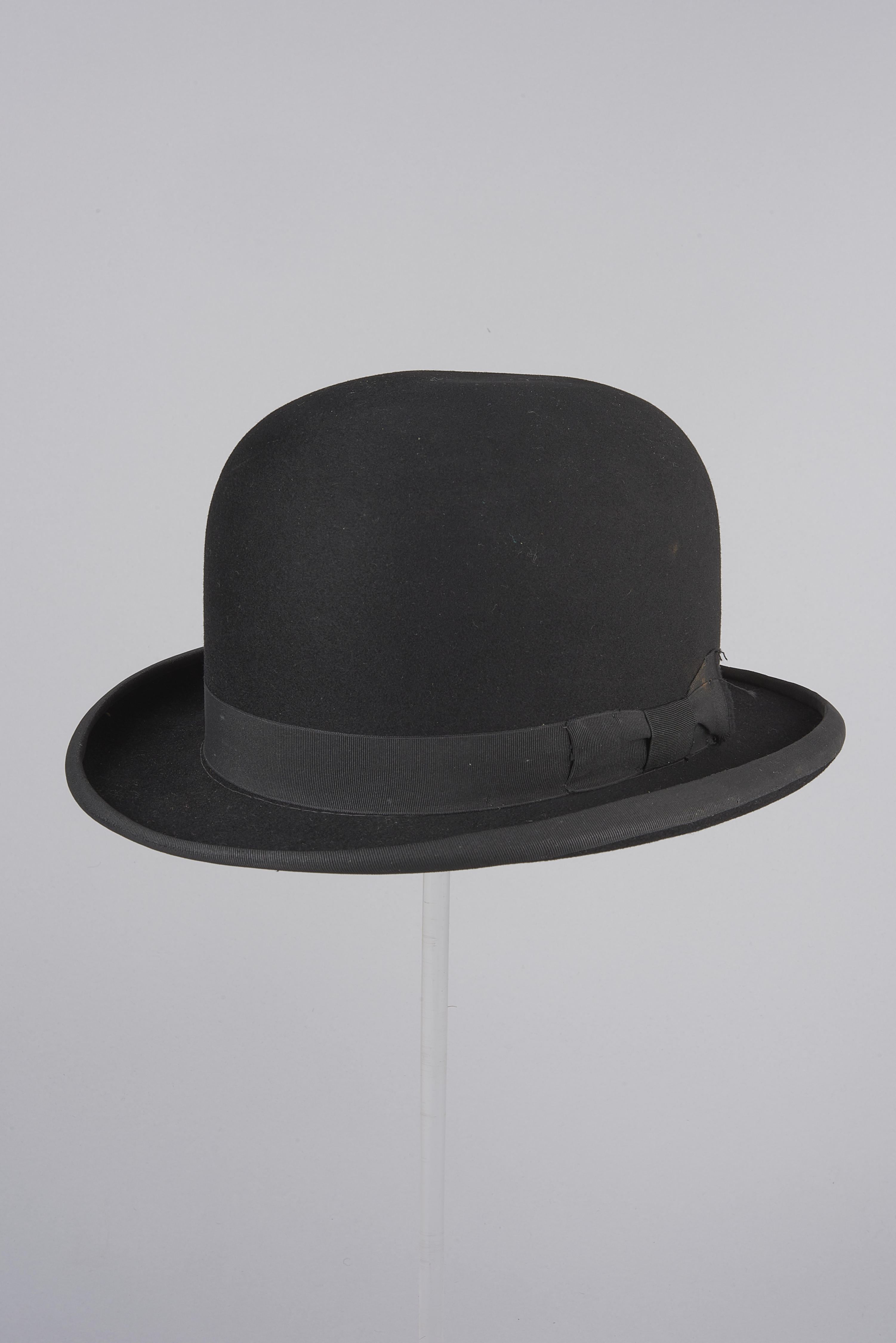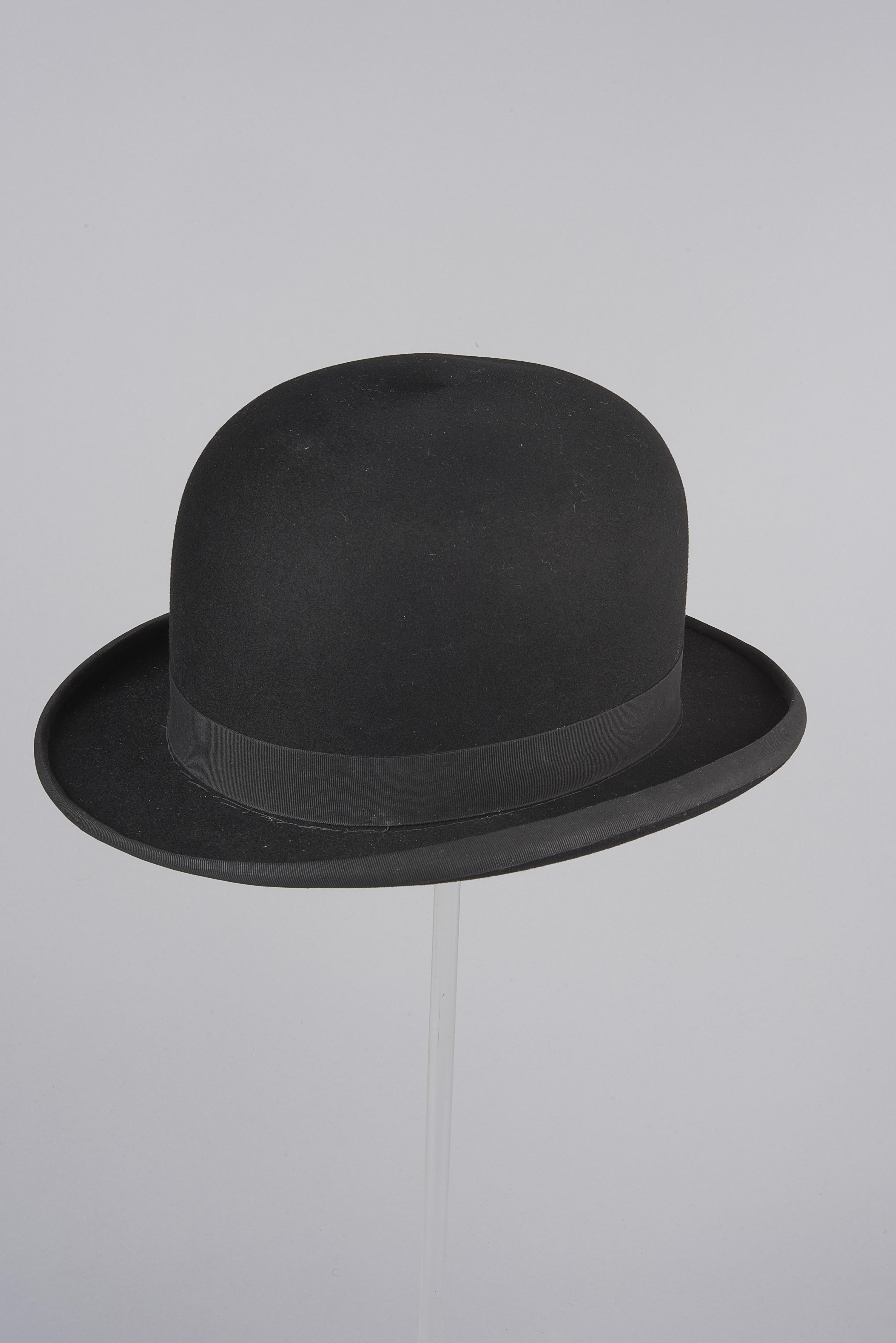 Zwarte vilten herenhoed met een ronde bol en een smalle rand, een zogenoemde bolhoed. De rand is rondom afgewerkt met zwart ripsband en is aan beide zijkanten iets omgekruld. Rond de basis van de bol zit een hoedenlint van zwart ripsband, dat aan de linkerkant van de bol tot een strik gevormd is. De hoed ...