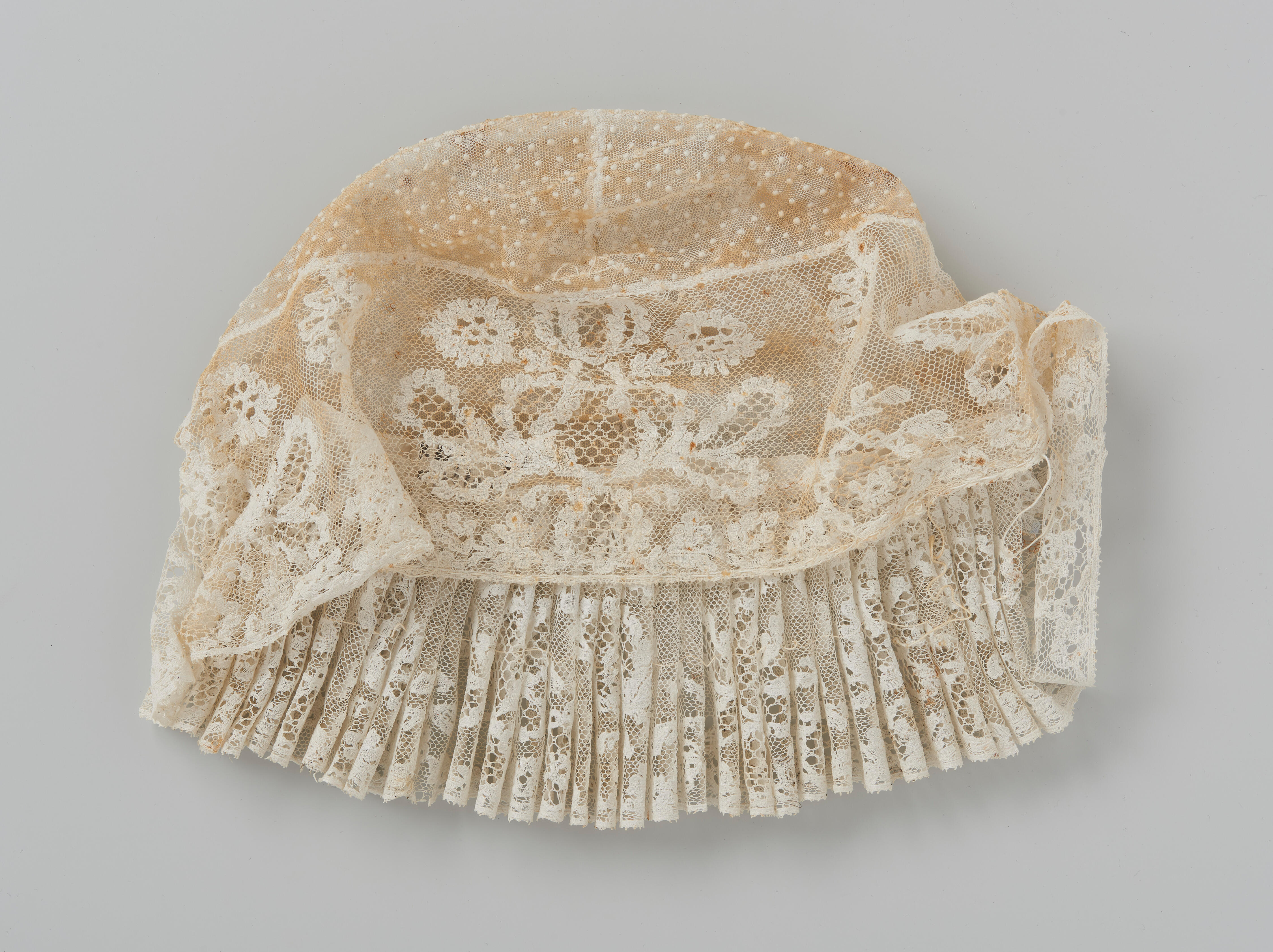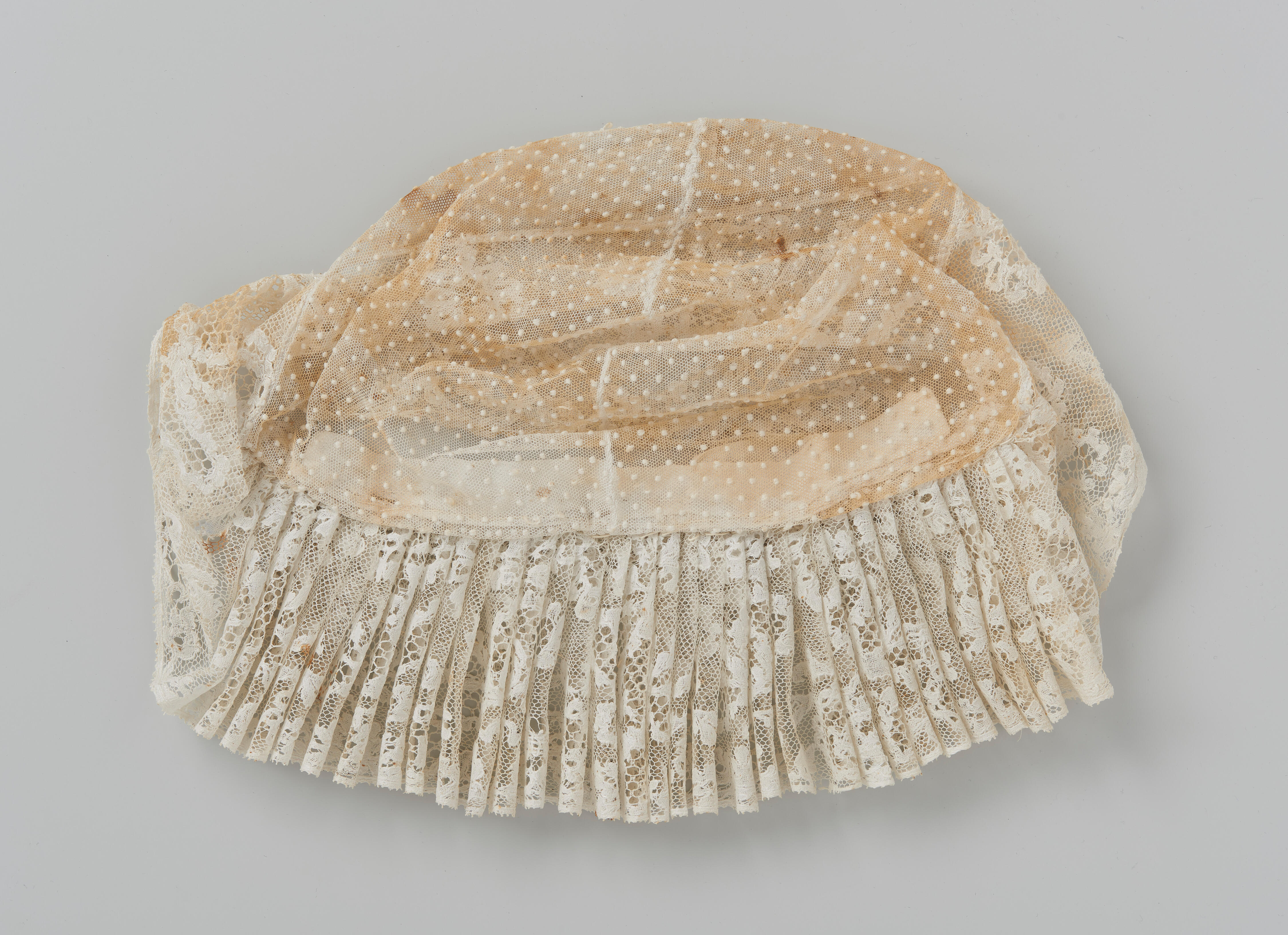 Floddermuts met een tulen bol en een kanten voor- en achterstrook, gedragen door een vrouw in Friese streekdracht. De floddermuts wordt gedragen over de witte ondermuts, de zwarte tussenmuts en het oorijzer. De bol is van gemoeste tule. De voor- en achterstrook zijn gemaakt van een strook brede Rijselse kloskant en hebben een patroon van ...