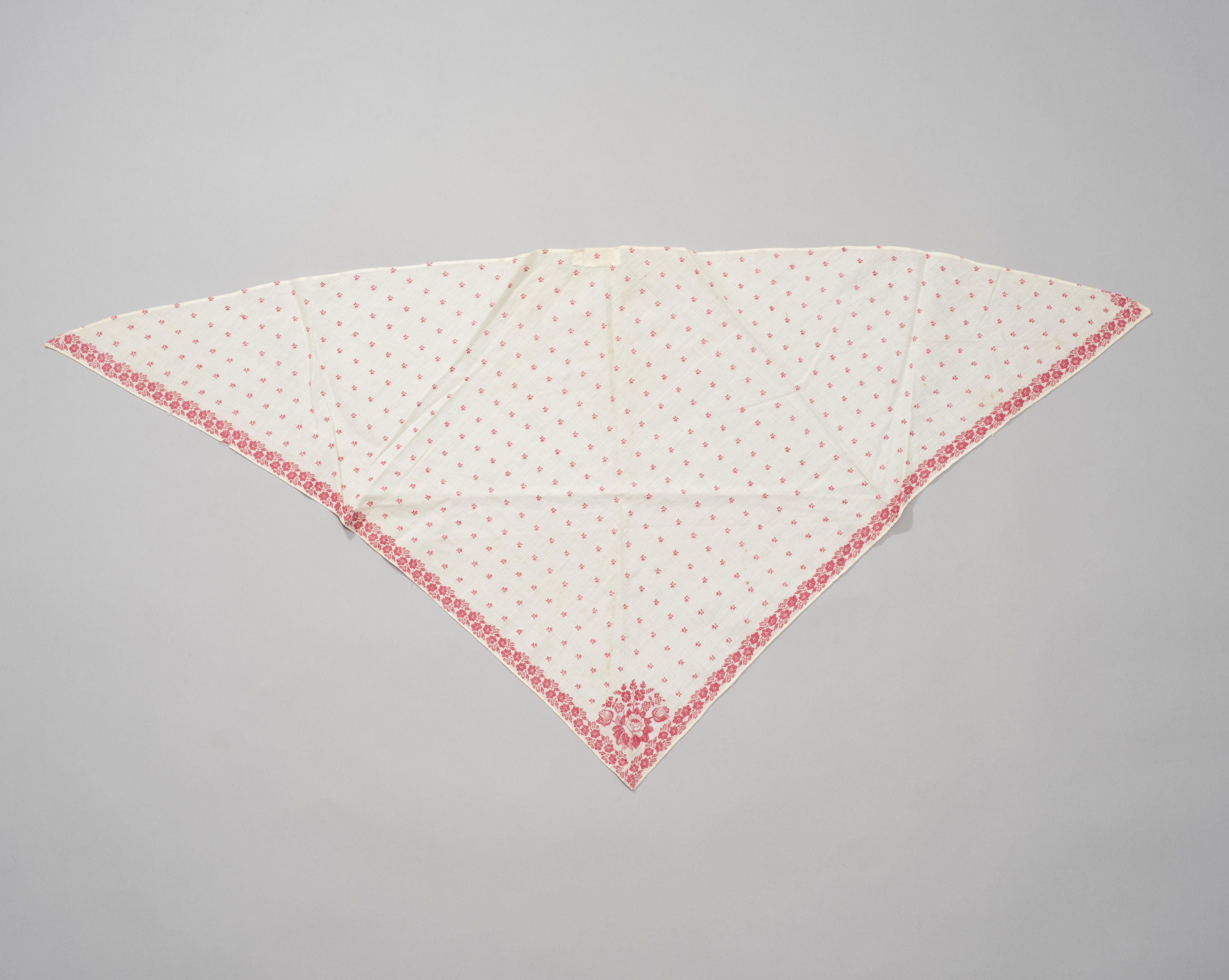 Driehoekige fichu van crèmekleurige katoenen batist met langs de korte zijden een ingeweven rand met rode bloemmotieven en een ingeweven strooimotief van kleine, rode bloemen. De fichu is afkomstig uit Friesland.