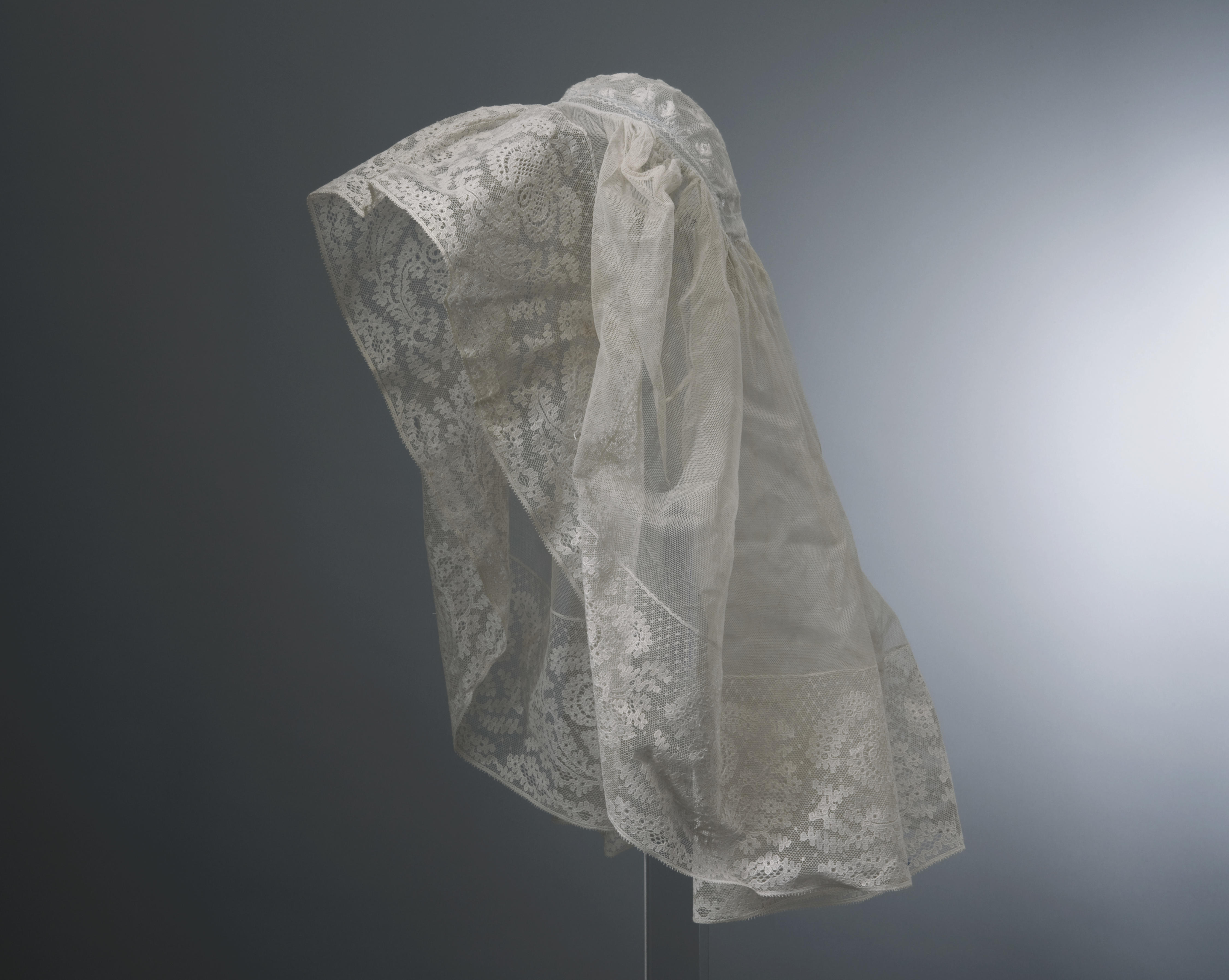 Keuvel met een bol van doorgestopte tule, een tulen strook en een kantstrook van Rijselse kant. De muts is vermoedelijk afkomstig van Goeree.