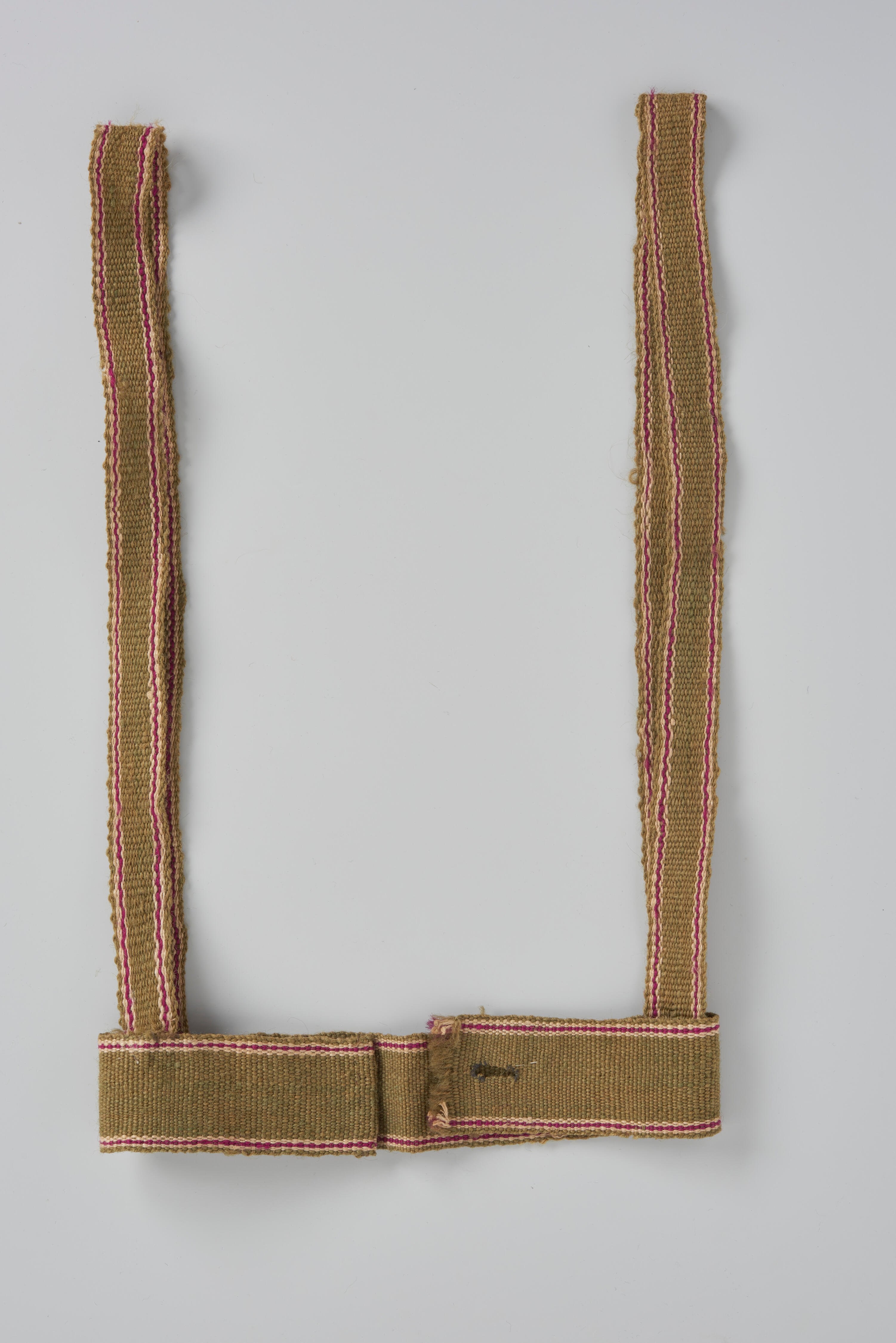 Een leiband, gebruikt voor een klein kind op het eiland Marken. Als het kind in de kakstoel werd gezet, werden de beide lange einden door het gat boven in de kakstoel gehaald en daar vastgemaakt. De leiband is gemaakt van groen wollen band met ingeweven rode en witte strepen. Het gedeelte dat om het lijf ...