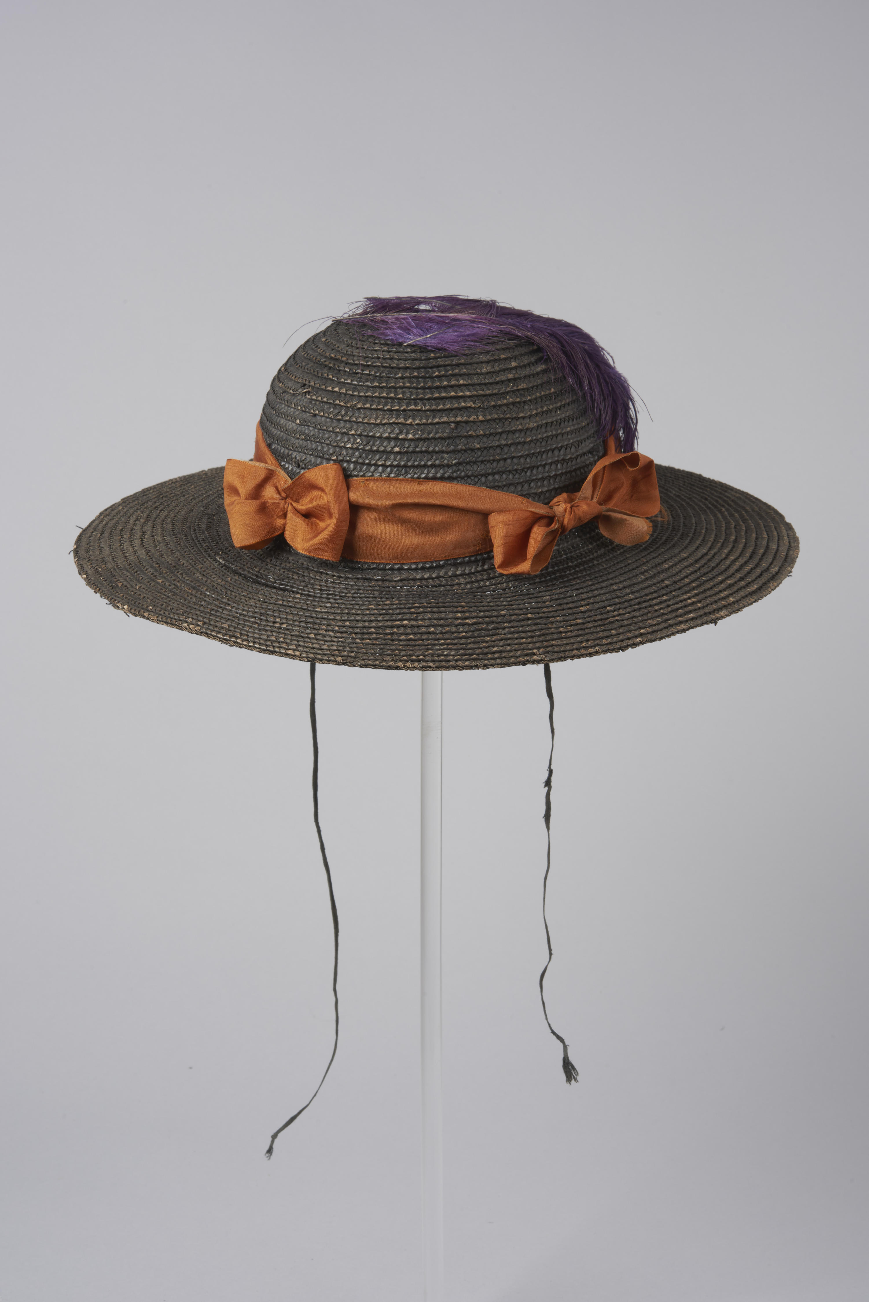 Meisjeshoed van stro met een versiering van veren en satijnen en zijden linten. De hoed behoort tot de protestantse dracht van Zuid-Beveland.