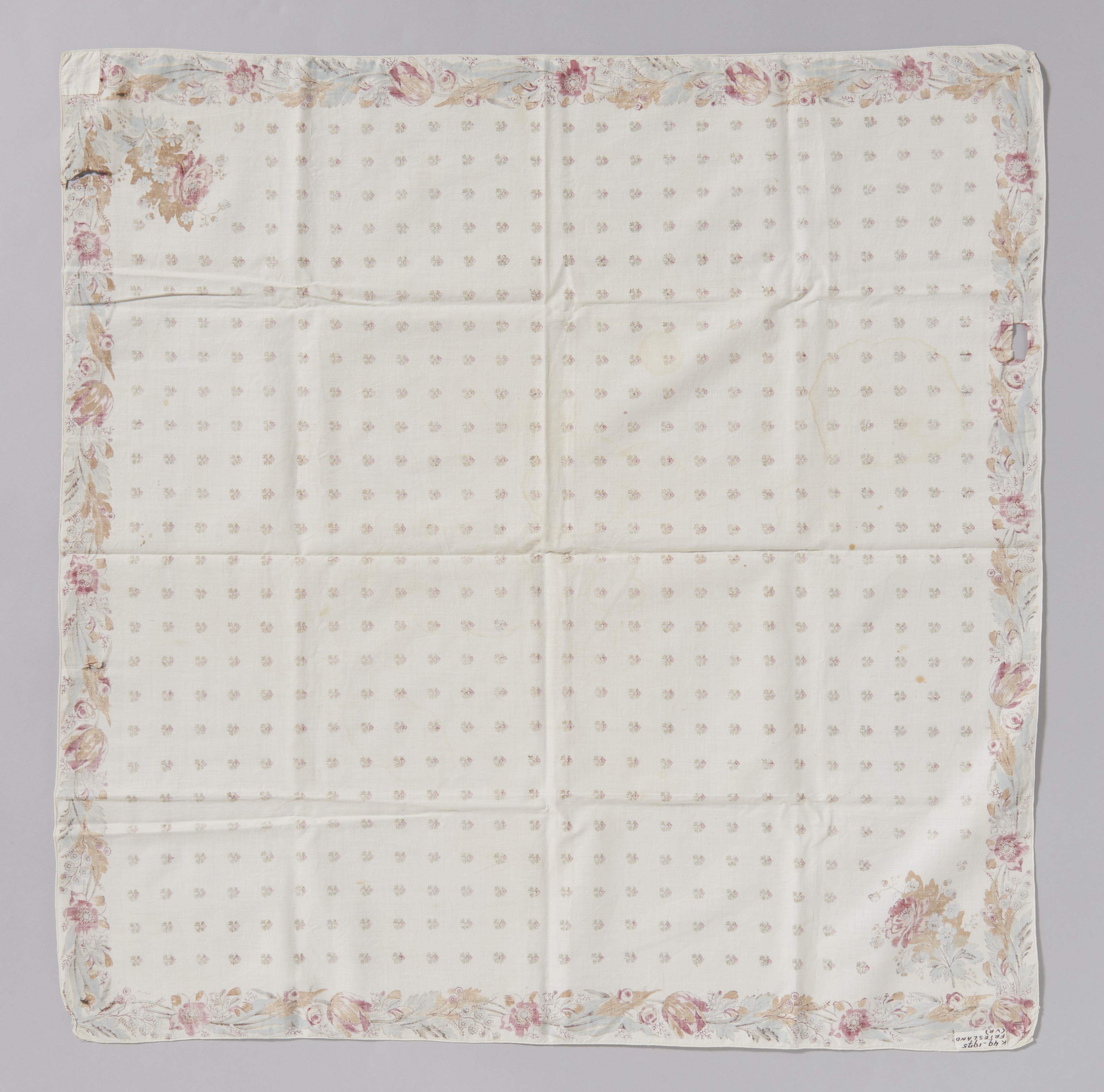 Vierkante tipdoek van bedrukte katoen met langs de vier zijden een rand met bloem- en bladmotieven en in twee tegenover elkaar liggende hoeken een groter bloemmotief. Het fond is versierd met een strooimotief van kleine bloemen. De tipdoek is afkomstig uit Friesland.