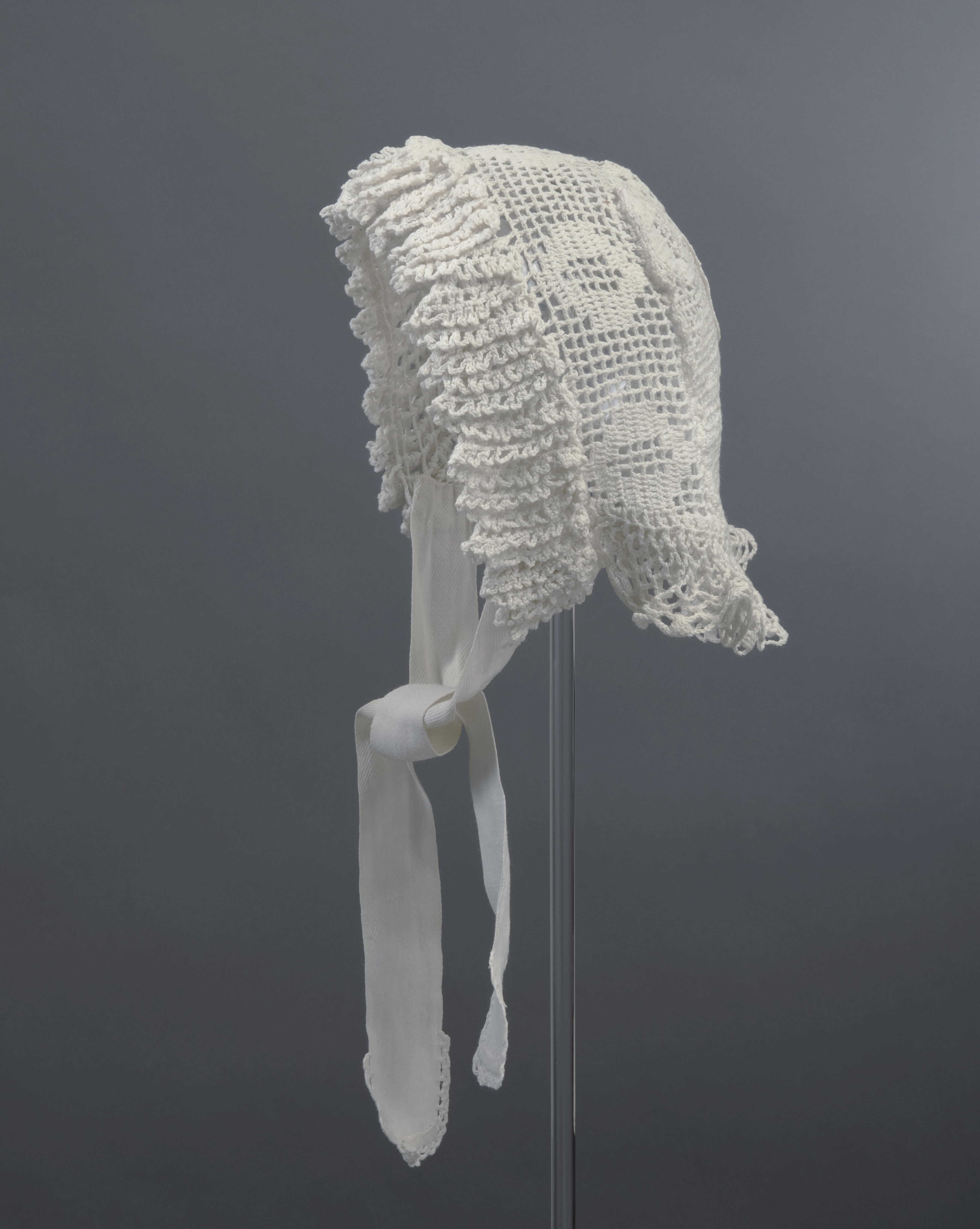 Gehaakt mutsje van witte katoen met strikbanden. ’s Nachts in bed en tijdens het werk in en om het huis droegen vrouwen eenvoudige mutsjes die zij goed zelf konden wassen. Vaak werden deze mutsjes door de draagster zelf gebreid of gehaakt. Dit mutsje is afkomstig uit de provincie Groningen.