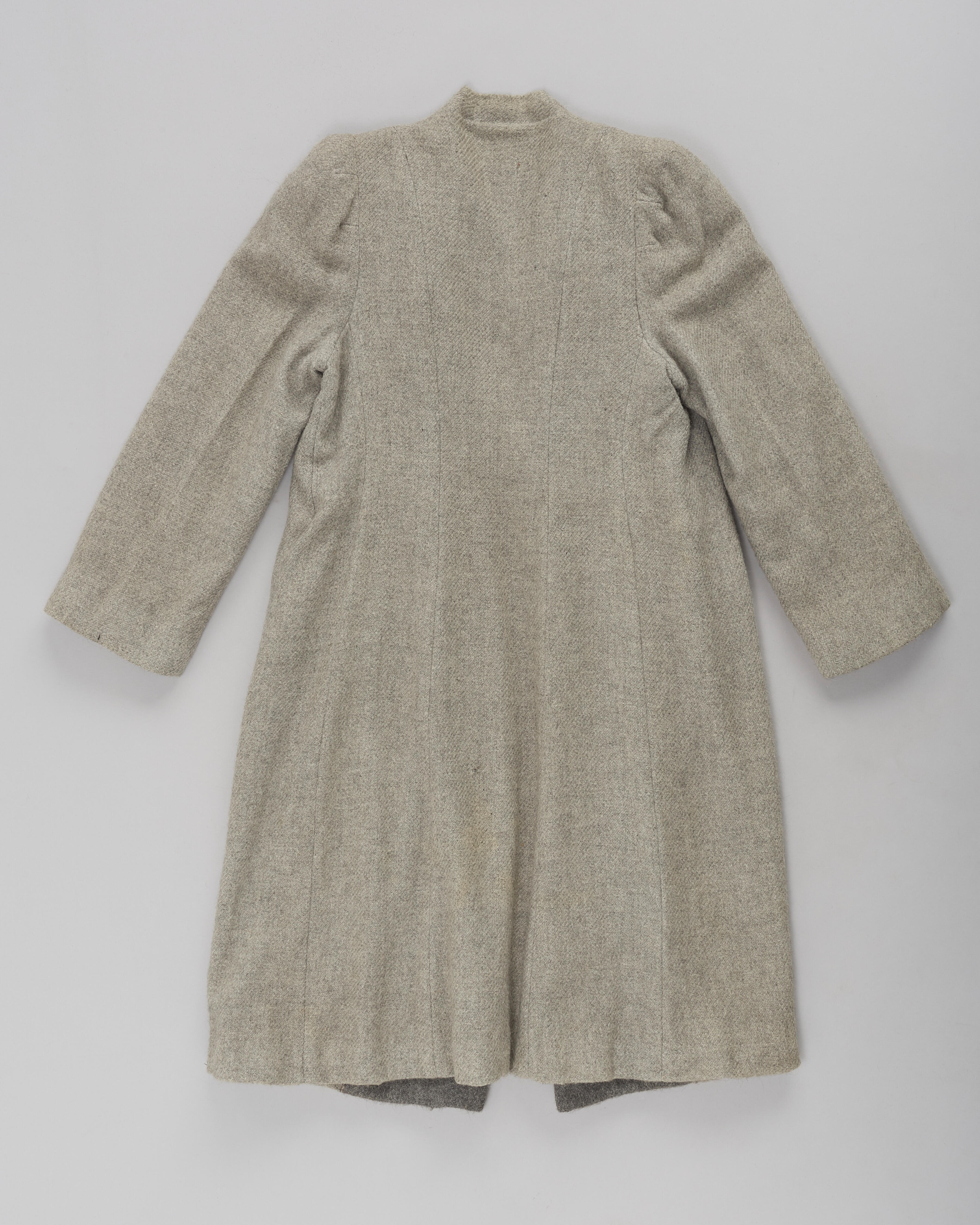 Mantel of jas van grove gekeperde wol met revers, de omslag van donkergrijze wol langs de sluiting. De jas is een losvallend swaggermodel. In de voering van kunstzijde zit een striklint om te tailleren. In de hals zit een etiket van Metz & Co, modehuis in Amsterdam en Den Haag.