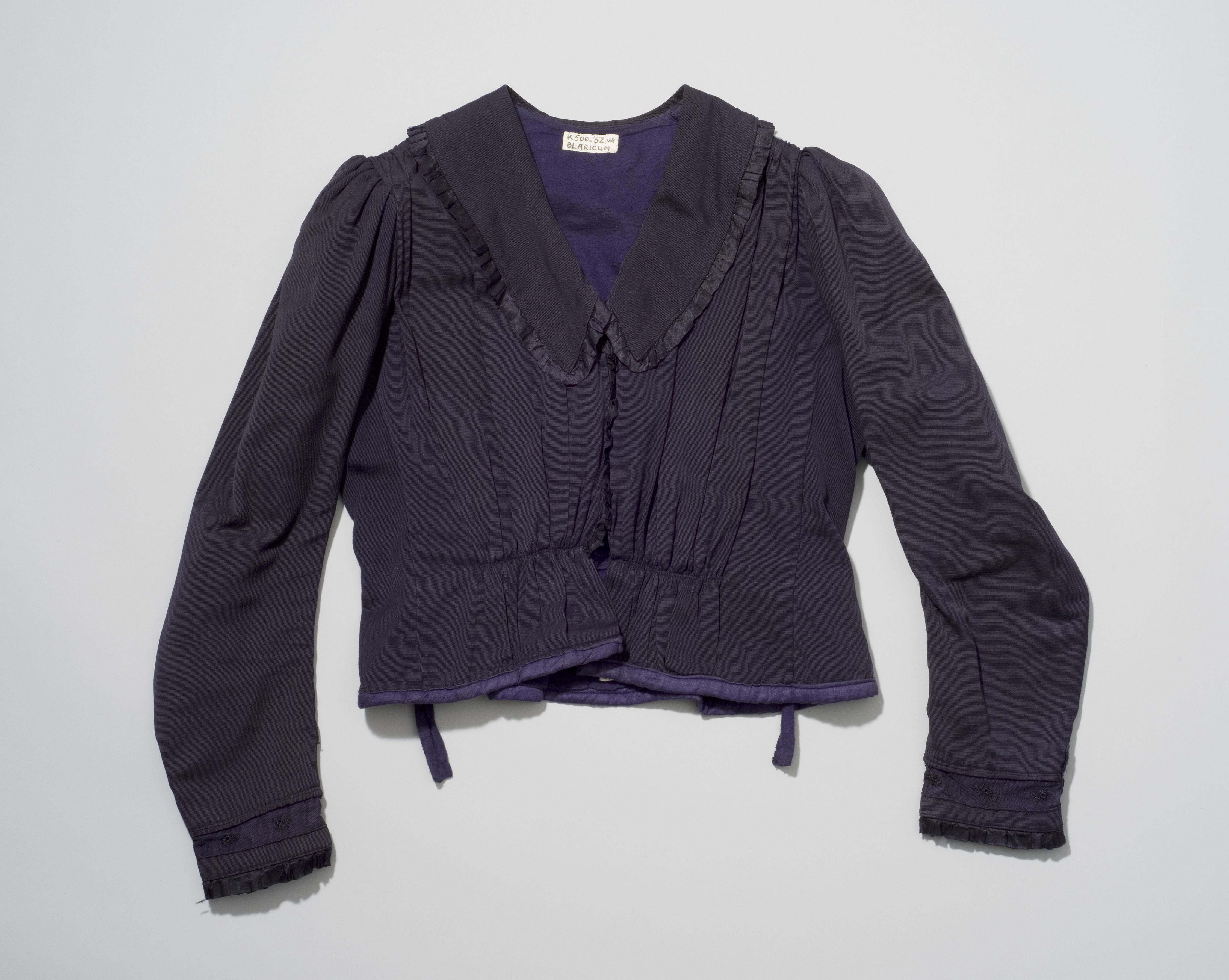 Vrouwenjak van donkerpaars katoenen thibet met lange mouwen en grote V-vormige kraag, gevoerd met een paarse, molton-achtige stof. Het jak vormt samen met een rok, ceintuur en befje een ensemble of kostuum. Het is afkomstig uit Blaricum.