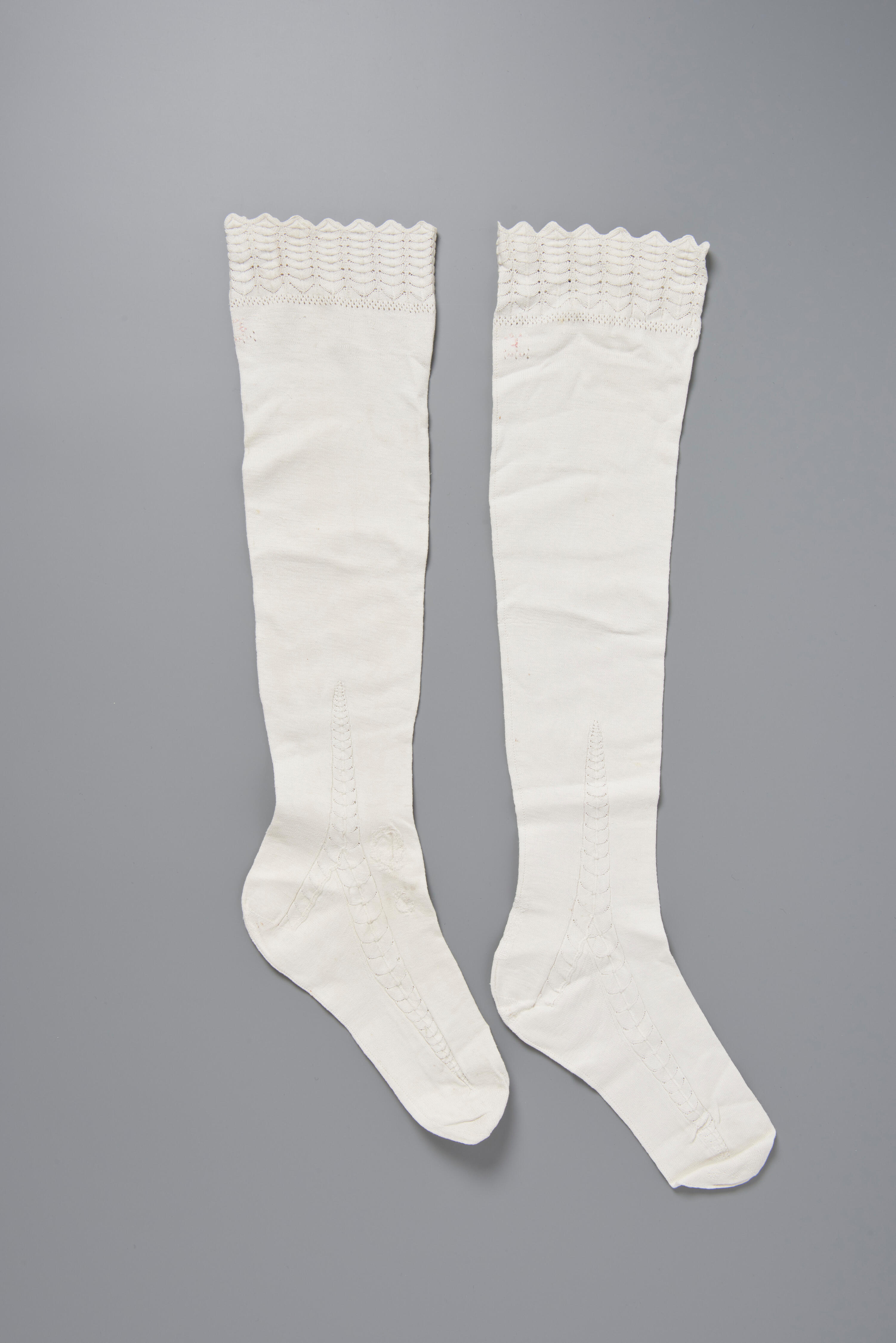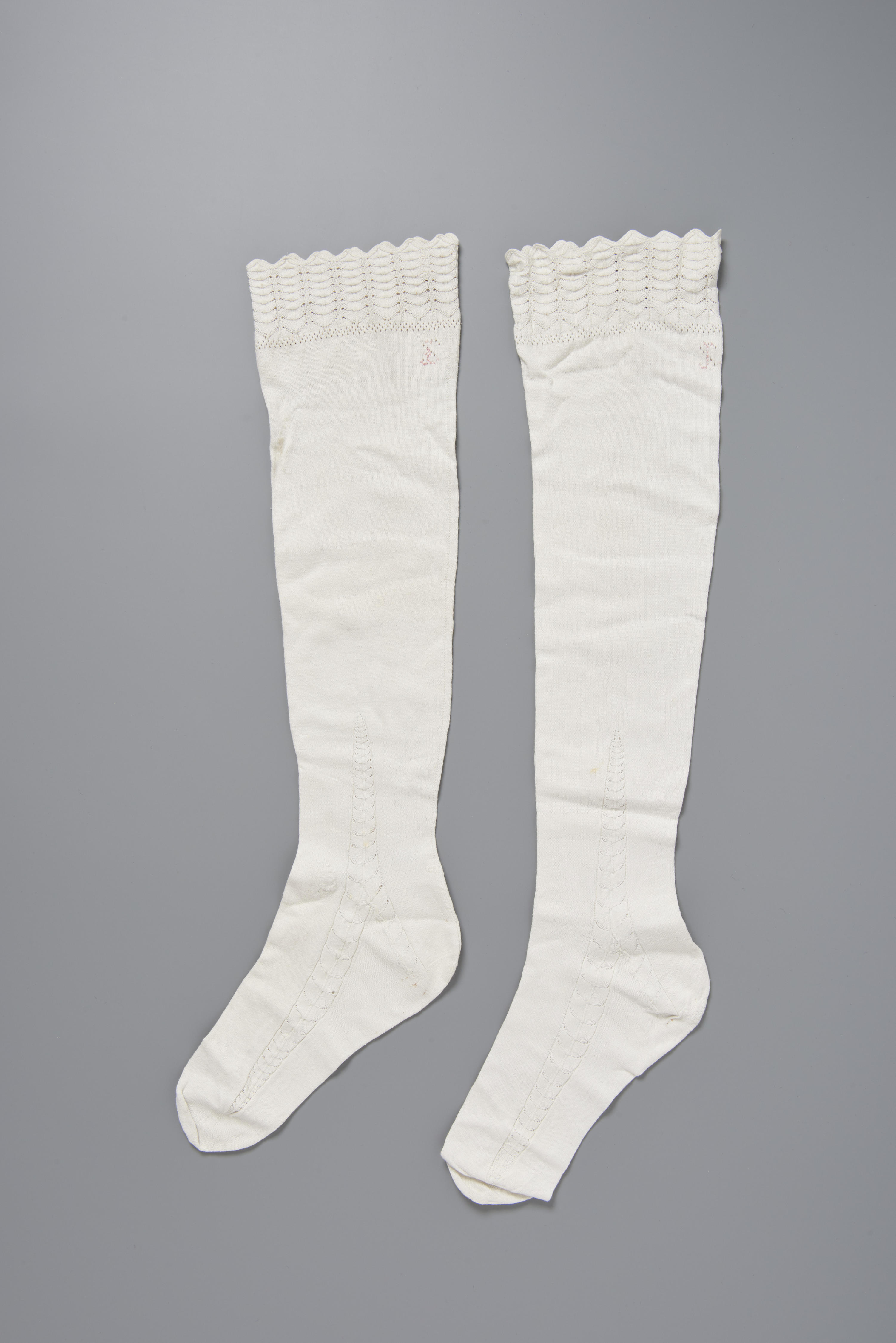 Een paar fijngebreide katoenen kousen met een rand van ajourbreiwerk aan de bovenzijde. De breister heeft een variatie op dit motief toegepast bij de klinken. Over de (op zijn kop) met gaatjes ingebreide initialen TS zijn later met rode kruissteken nieuwe initialen geborduurd. Er zitten meerdere stoppen in de kousen.