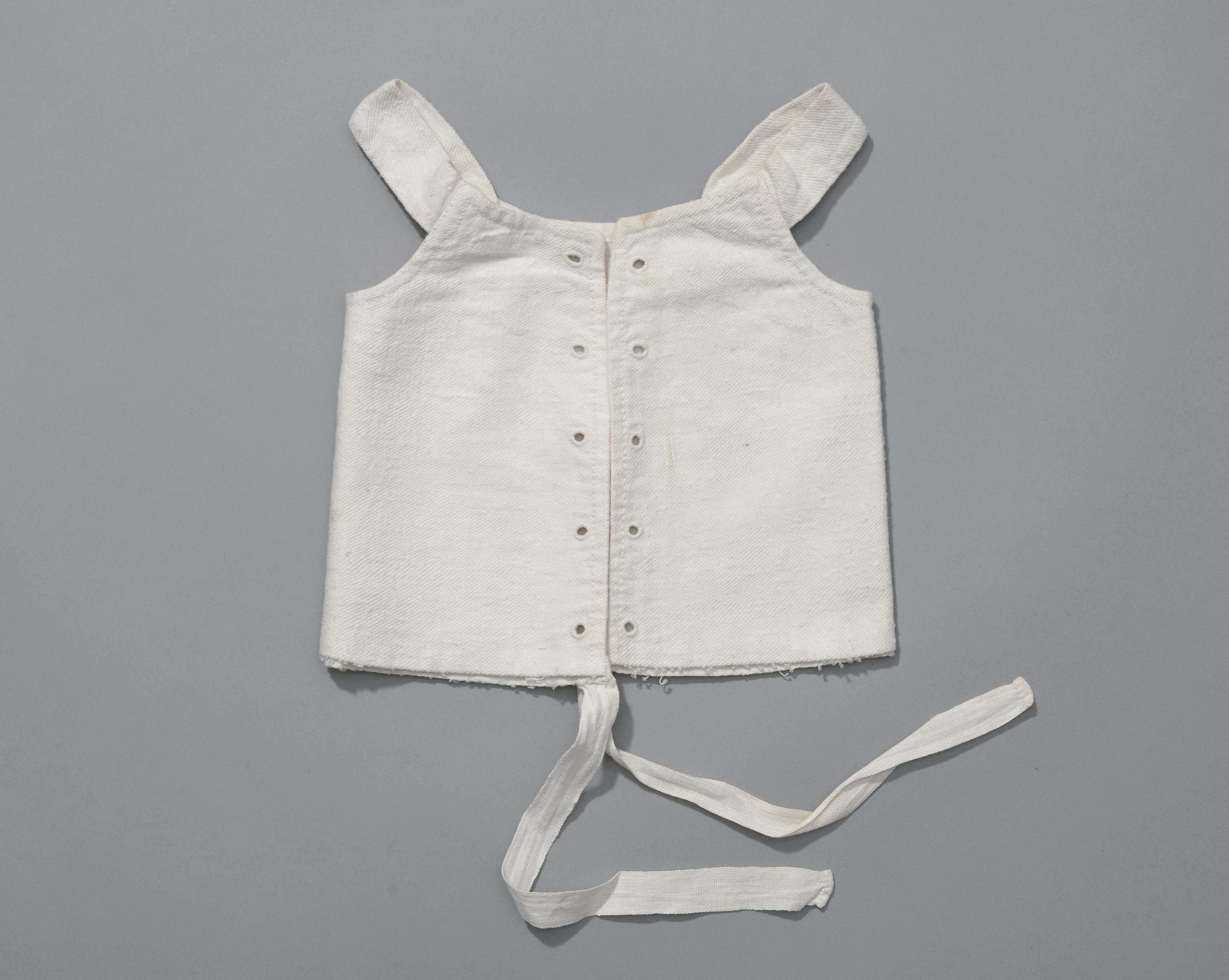 Katoenen lijfje of korsetje voor een baby. Door de nestelgaatjes kan een veter worden geregen waarmee het lijfje dichtgesnoerd kan worden.