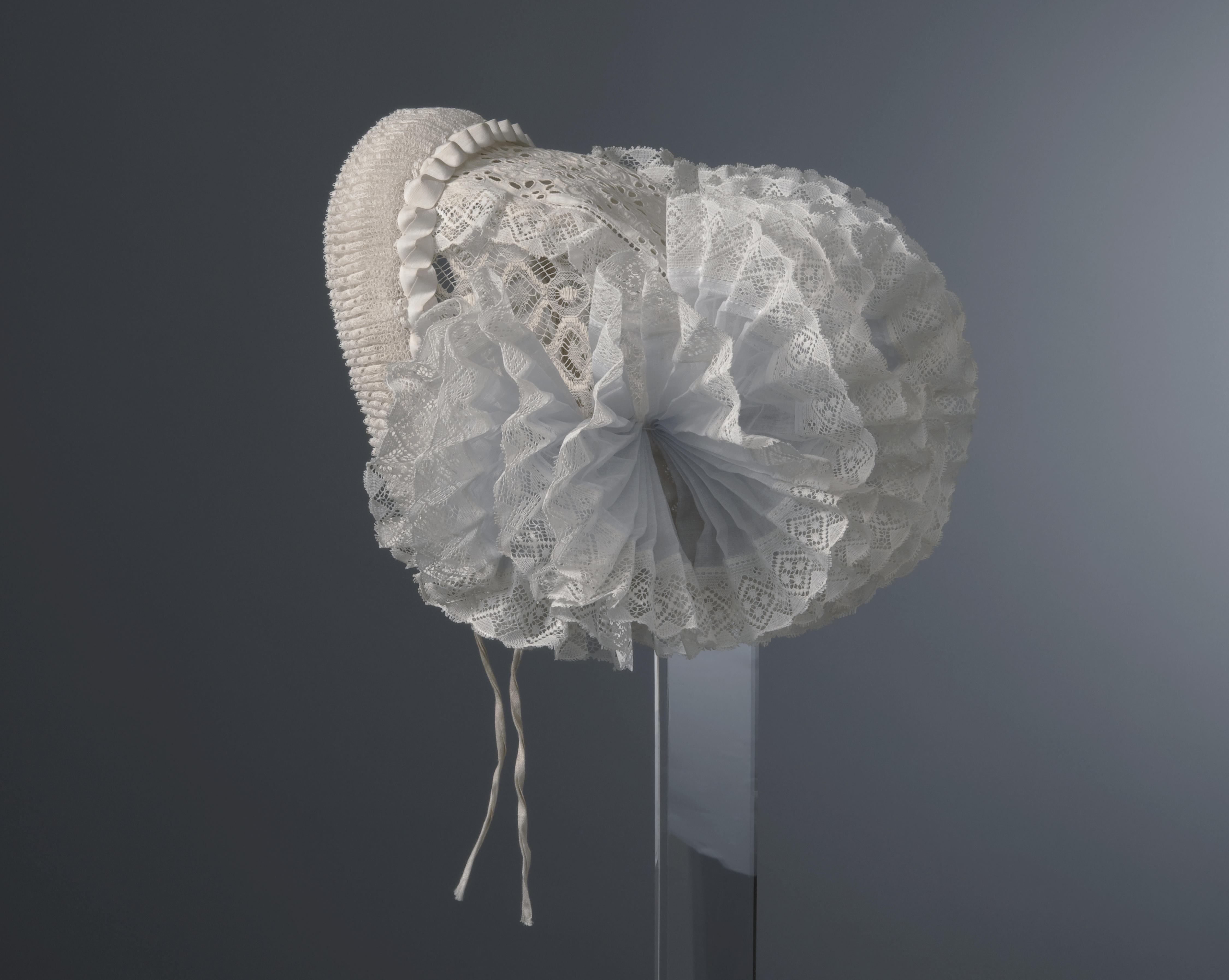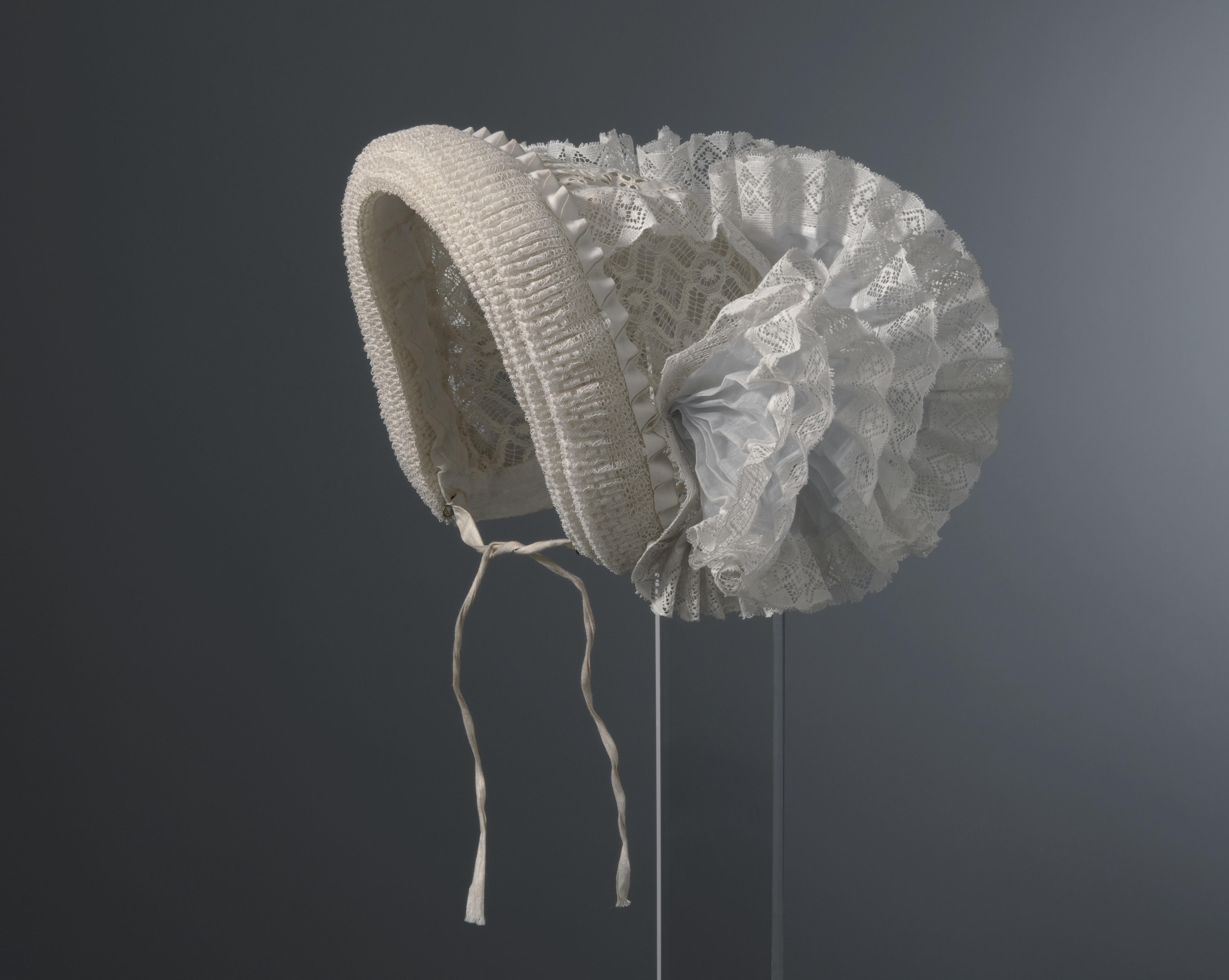 Zogenaamde ‘driestrokenmuts’ met een bol van kant en broderie anglaise. De waaiervormige strook batist aan de achterzijde is licht geblauwd en afgezet met een 3 centimeter breed kantje. Aan de voorzijde van de muts zitten langs het gezicht drie gepijpte kantstroken, waaraan de muts zijn naam dankt. Op de kinbandjes werd een losse sierstrik bevestigd. ...