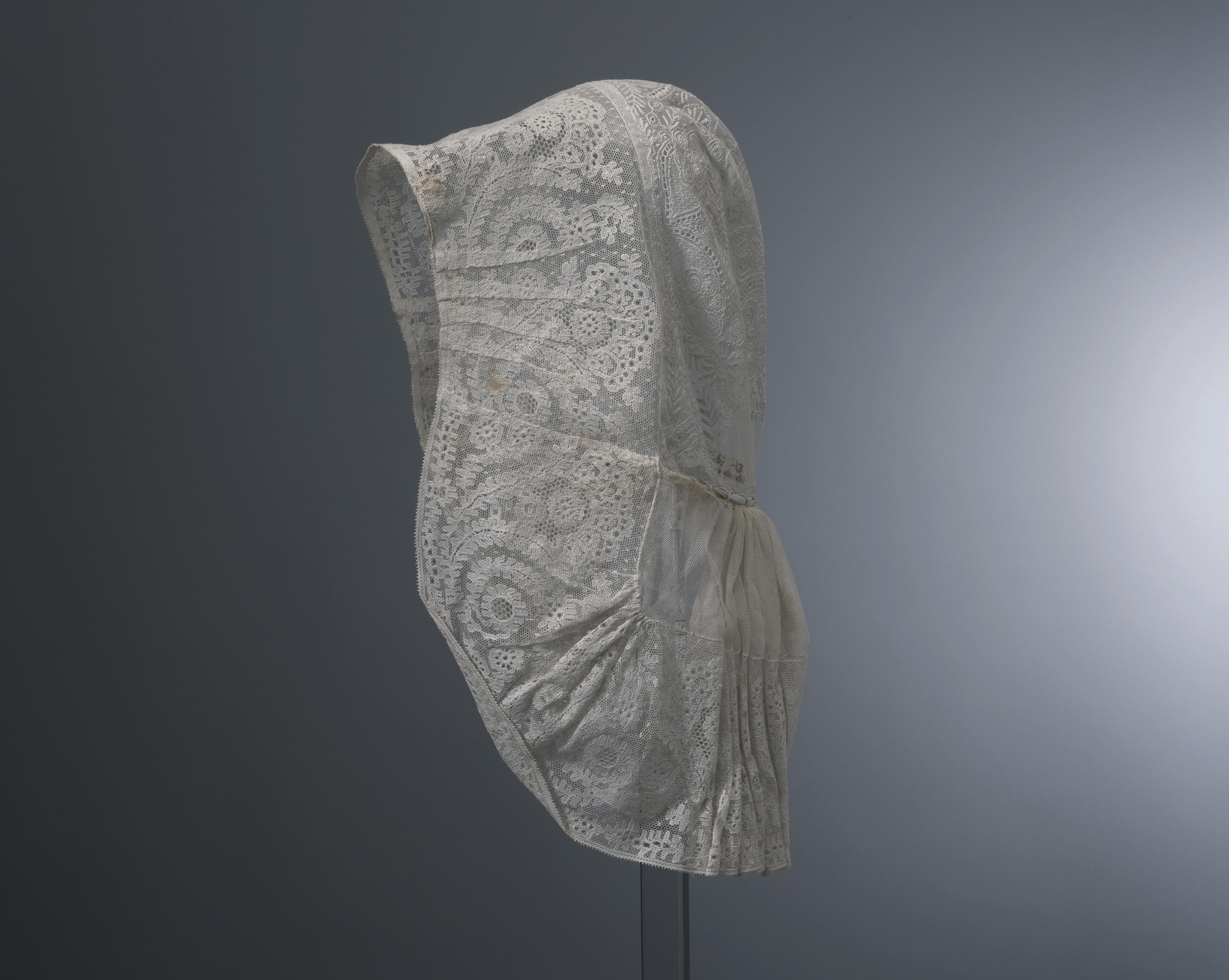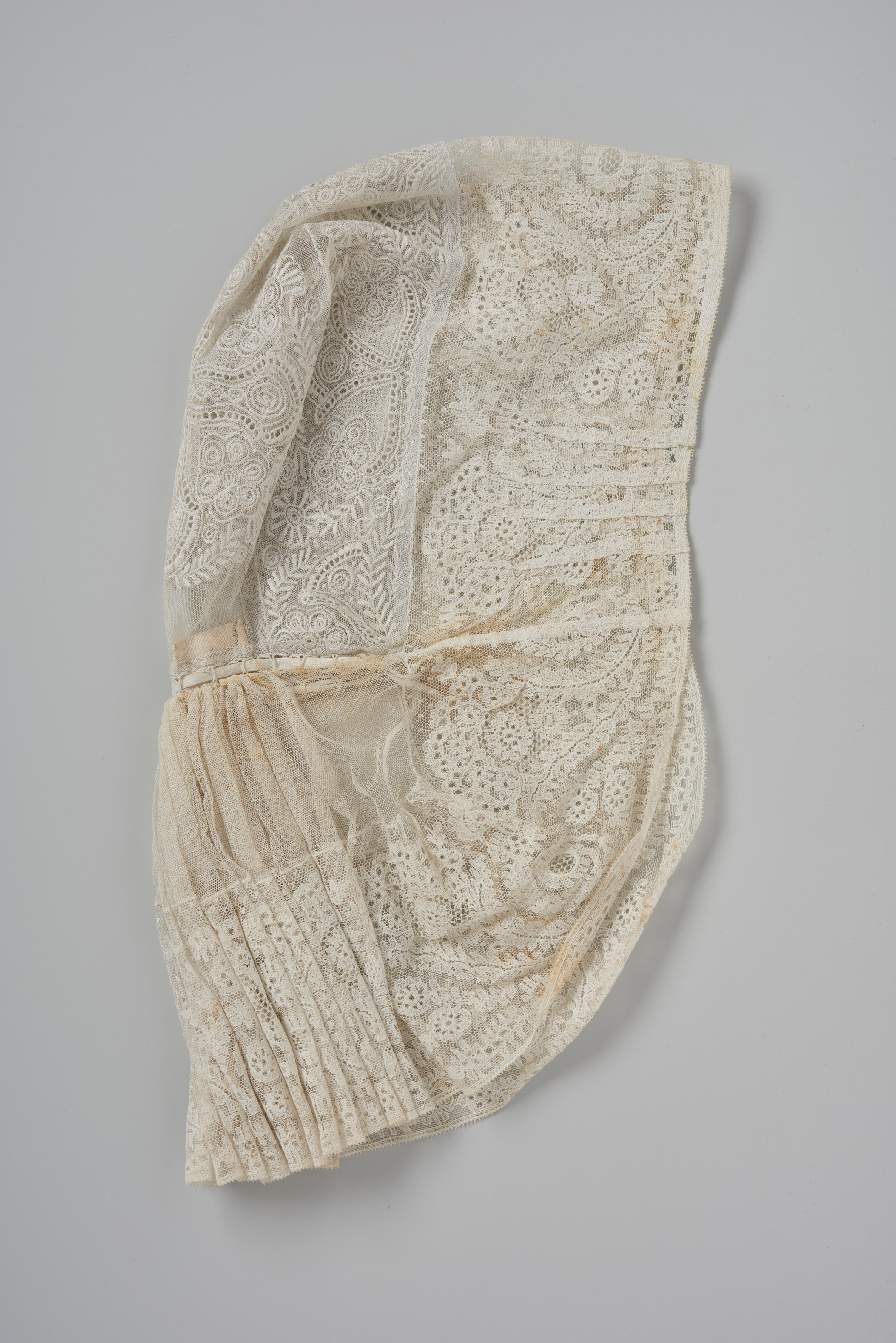 Muts, gedragen door een vrouw in streekdracht uit Zandvoort. Deze zogenoemde lange kap werd gedragen door vrouwen van bijvoorbeeld middenstanders. De vissersvrouwen droegen een hul. De bol van deze muts bestaat uit een achterpand en een pas van machinale tule, versierd met borduurwerk. De kantstrook is van machinale kant. Dit is een machinale imitatie van ...