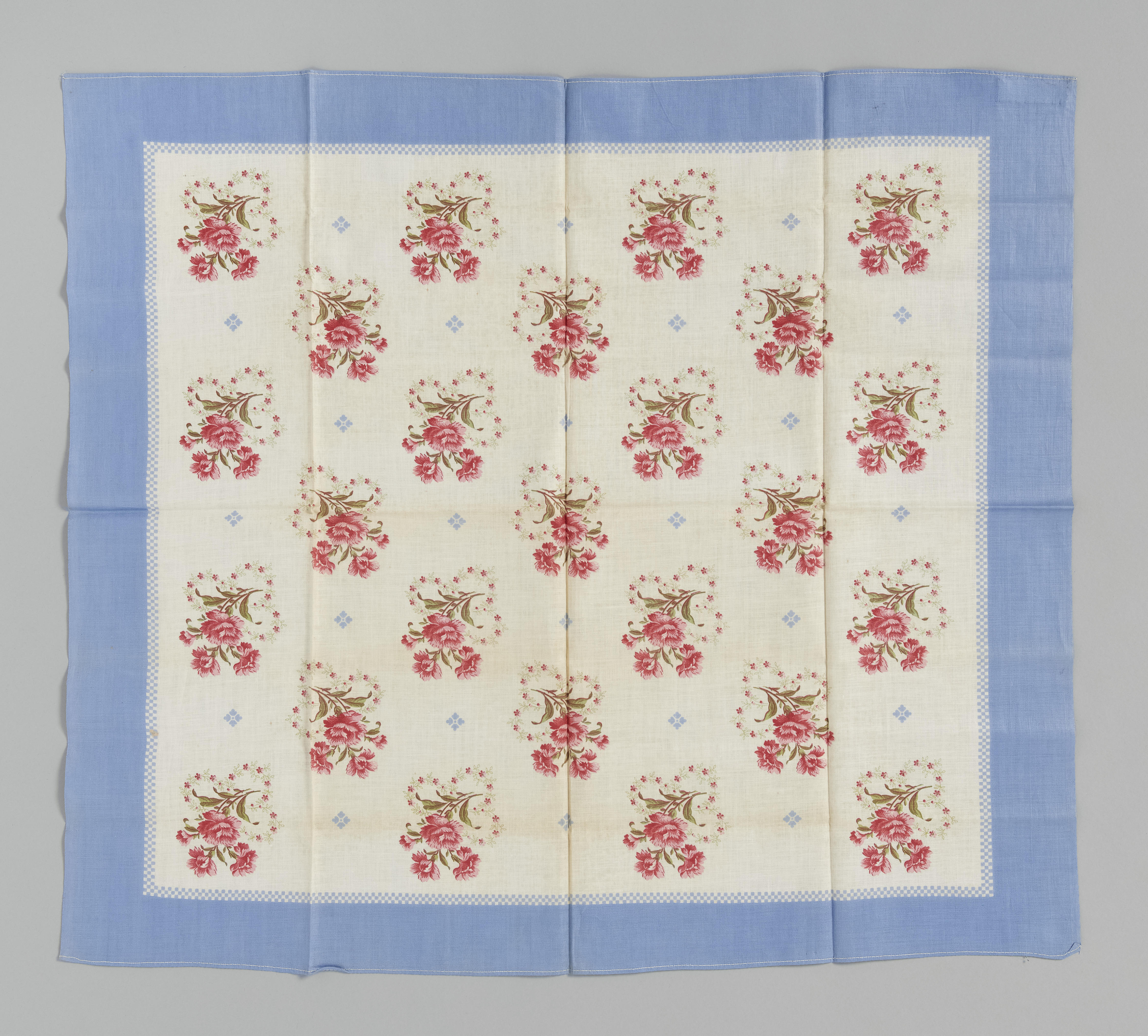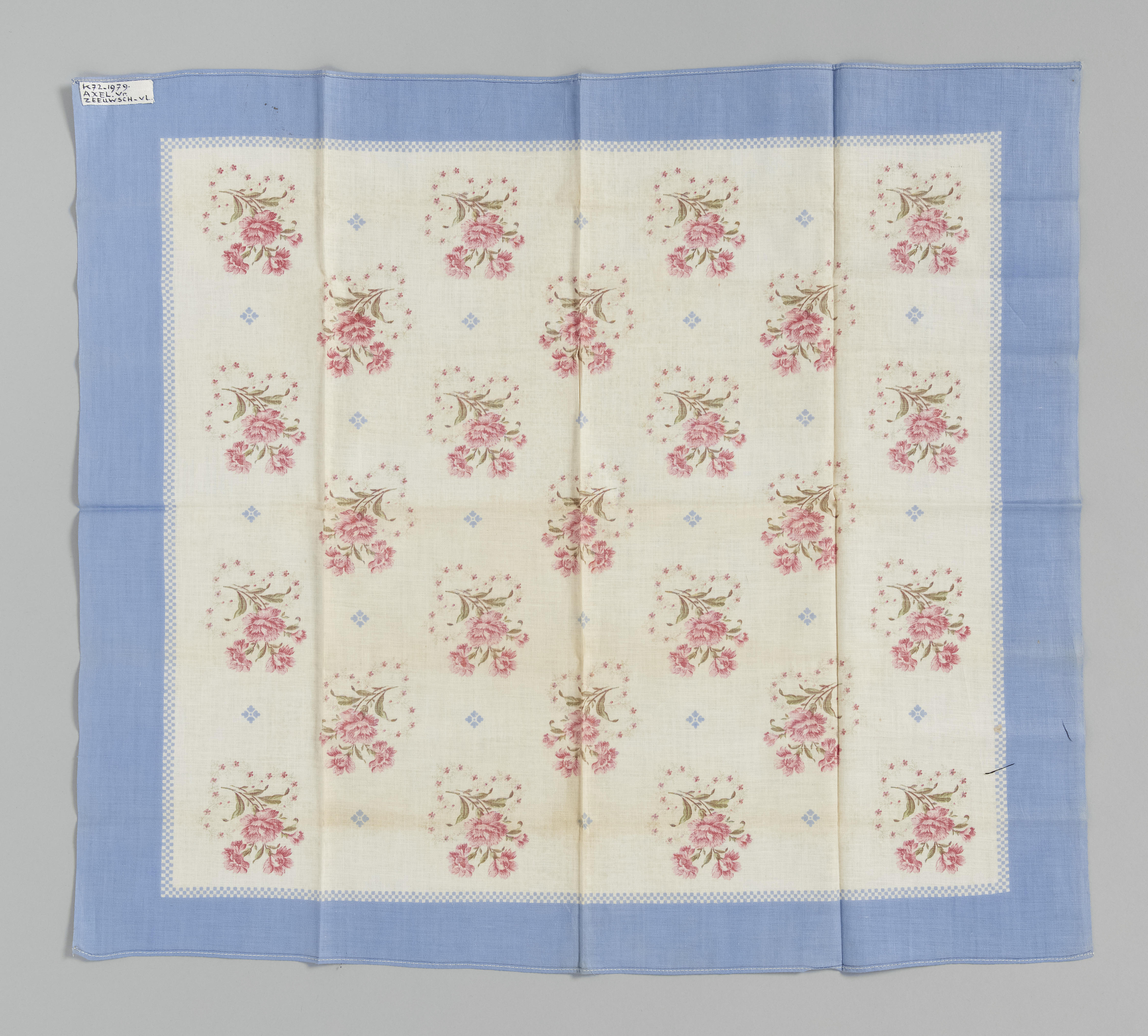 Vierkante fichu van witte katoen met een effenblauwe rand en een strooimotief van boeketjes met rode bloemen en blauwe motiefjes. De fichu is afkomstig uit Axel.