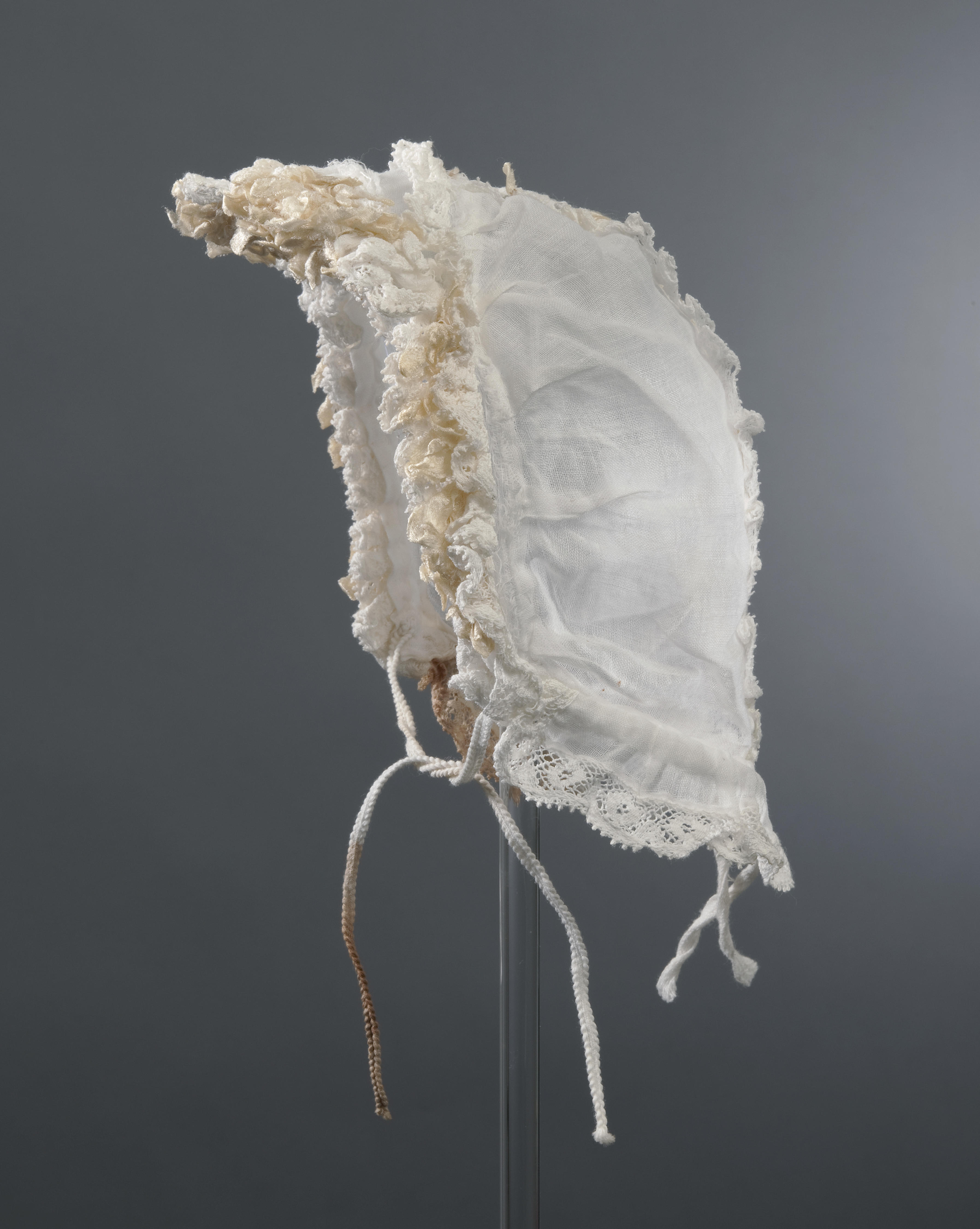 Doopmutsje met een batisten bol en stroken van machinale kant. De muts is gedragen in Oldeboorn.