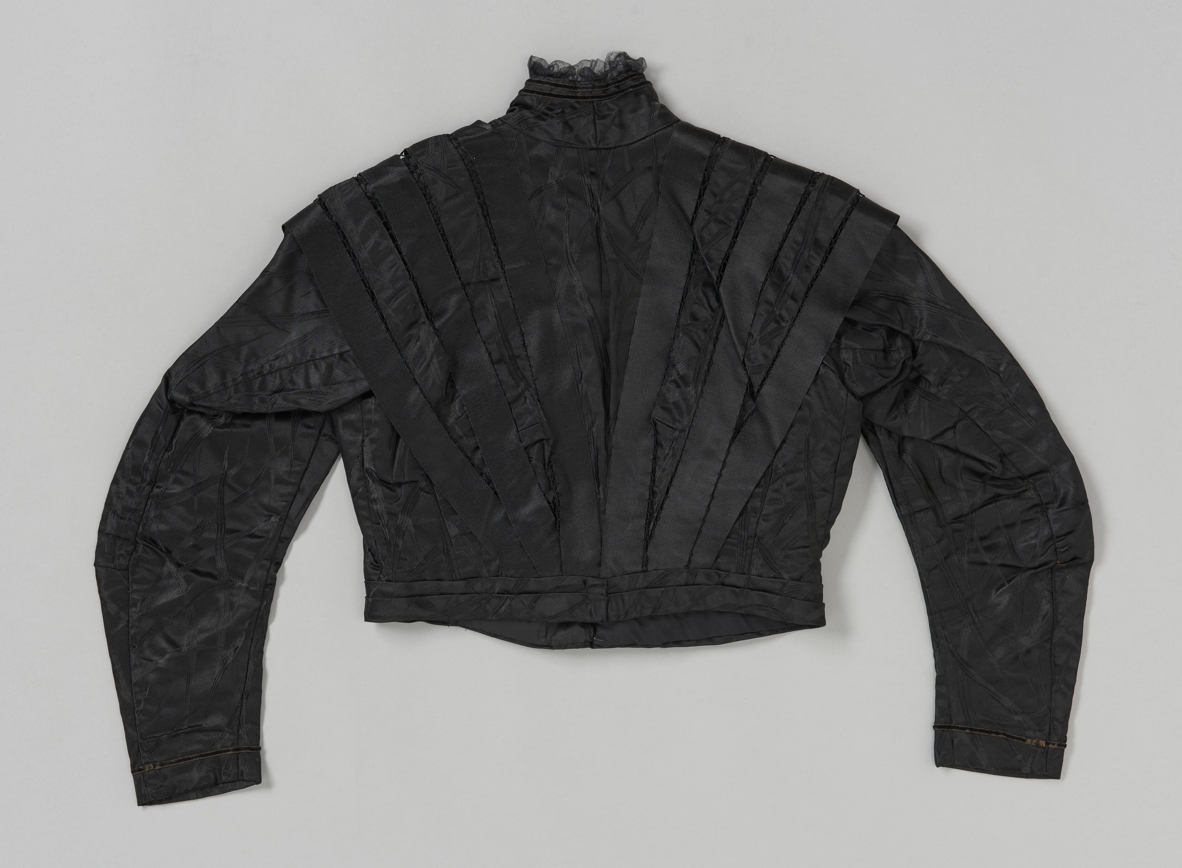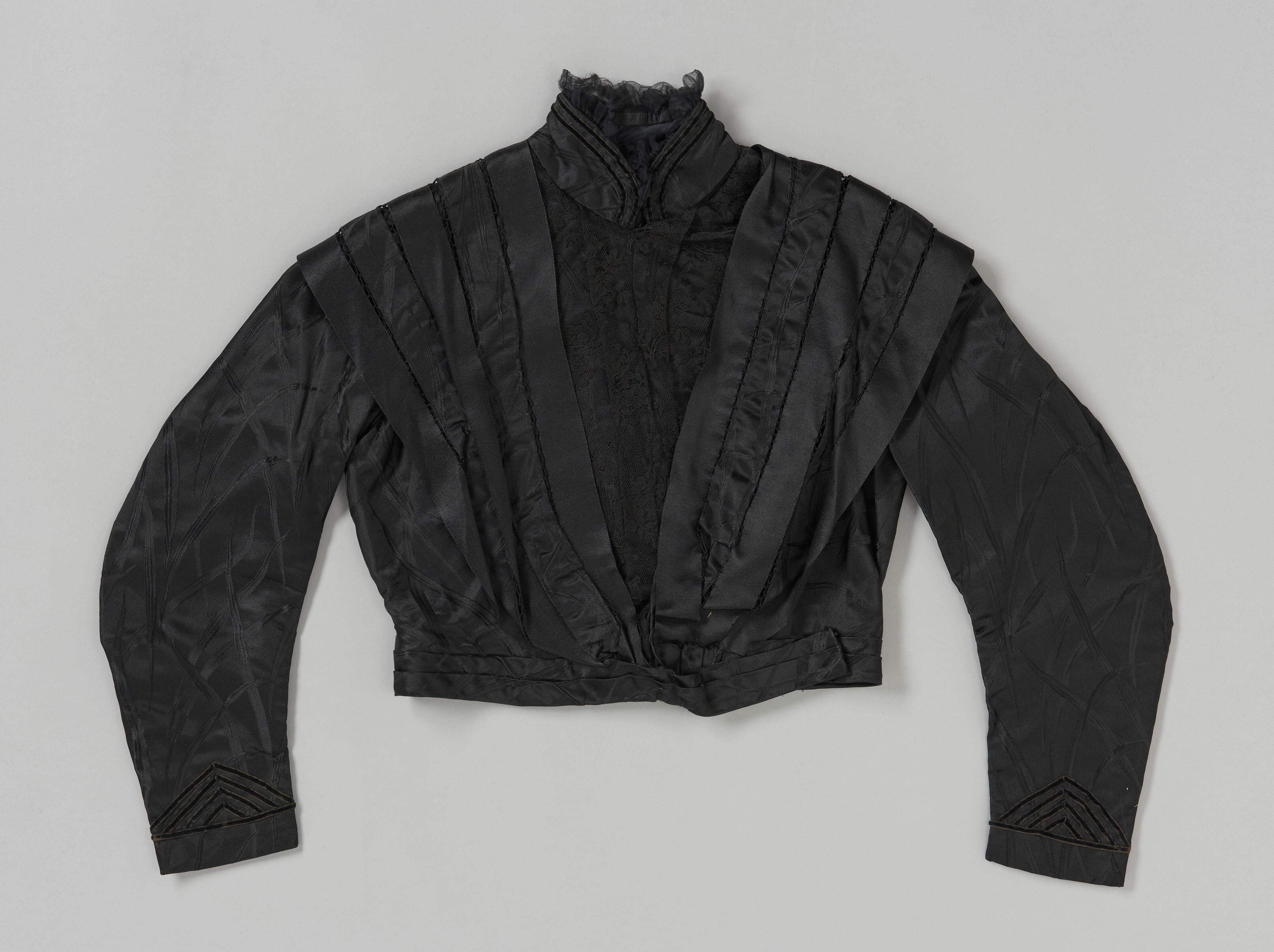 Japonlijf van zwarte tafzijde. Het is een hooggesloten model met lange mouw en onderdeel van een tweedelige japon. Het lijfje is gegarneerd met zwarte machinale kant. Over de voering heen zijn aan de voor- en achterzijde smalle, verticale stroken zijde gezet die de smalle taille nog extra benadrukken.