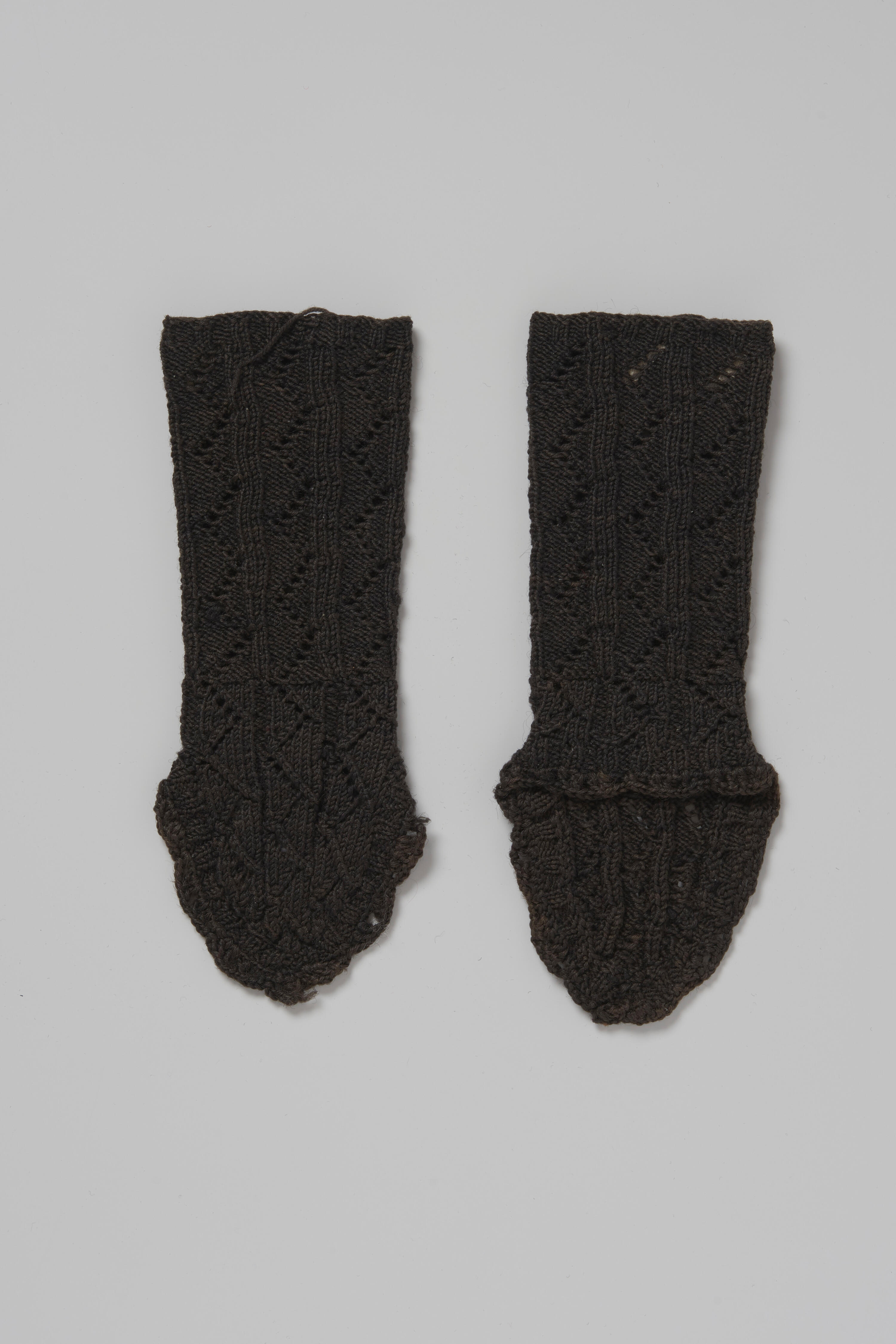 Een paar korte ajourgebreide mitaines van zwarte wol, gedragen door een meisje in Urker streekdracht bij de zondagse kerkdracht en bij gelegenheidskleding, zoals naar een begrafenis. Deze mitaines worden op Urk 'wintjes' (wantjes) genoemd. Ze worden rond de pols gedragen. Tijdens het gebruik wordt het puntige gedeelte vanaf de hand teruggeslagen op de pols. Hiermee ...