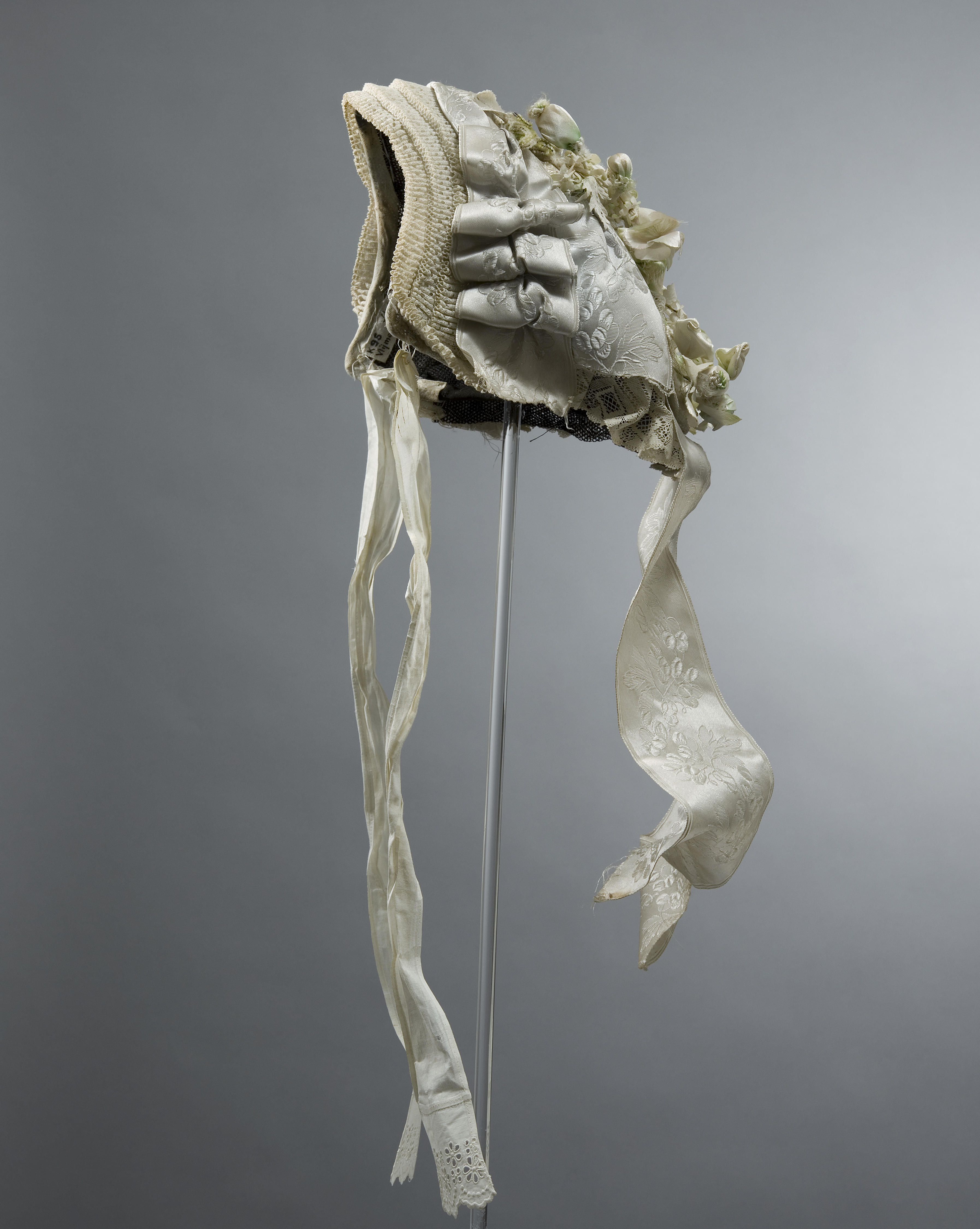 Zondagse muts op een basis van zwart gaas, opgemaakt met doorgestopte tule, gepijpte stroken machinale kant, gebrocheerd zijden lint, zijden passement en kunstbloemen. De keelbanden zijn van katoen en hebben aan de uiteinden stroken van broderie anglaise. De muts is afkomstig uit Vlijmen.