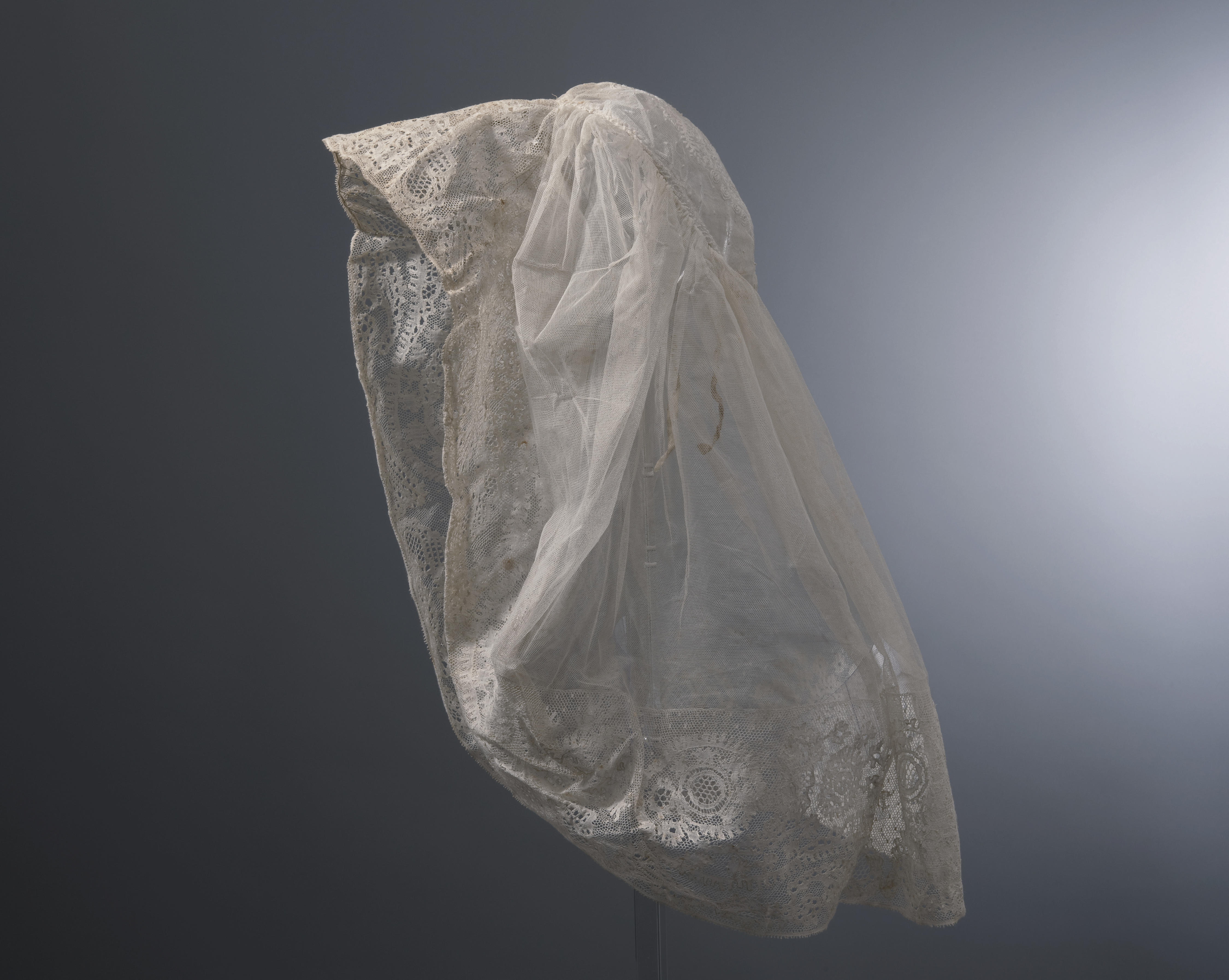 Sluiermuts met een bol van in platsteek geborduurde en doorgestopte tule met daaraan een sluier van effen tule met een 14 centimeter brede Rijselse kloskant. De voorstrook wordt door een karkas van wit laitondraad in vorm gehouden. De muts is afkomstig uit Oud Vossemeer.
