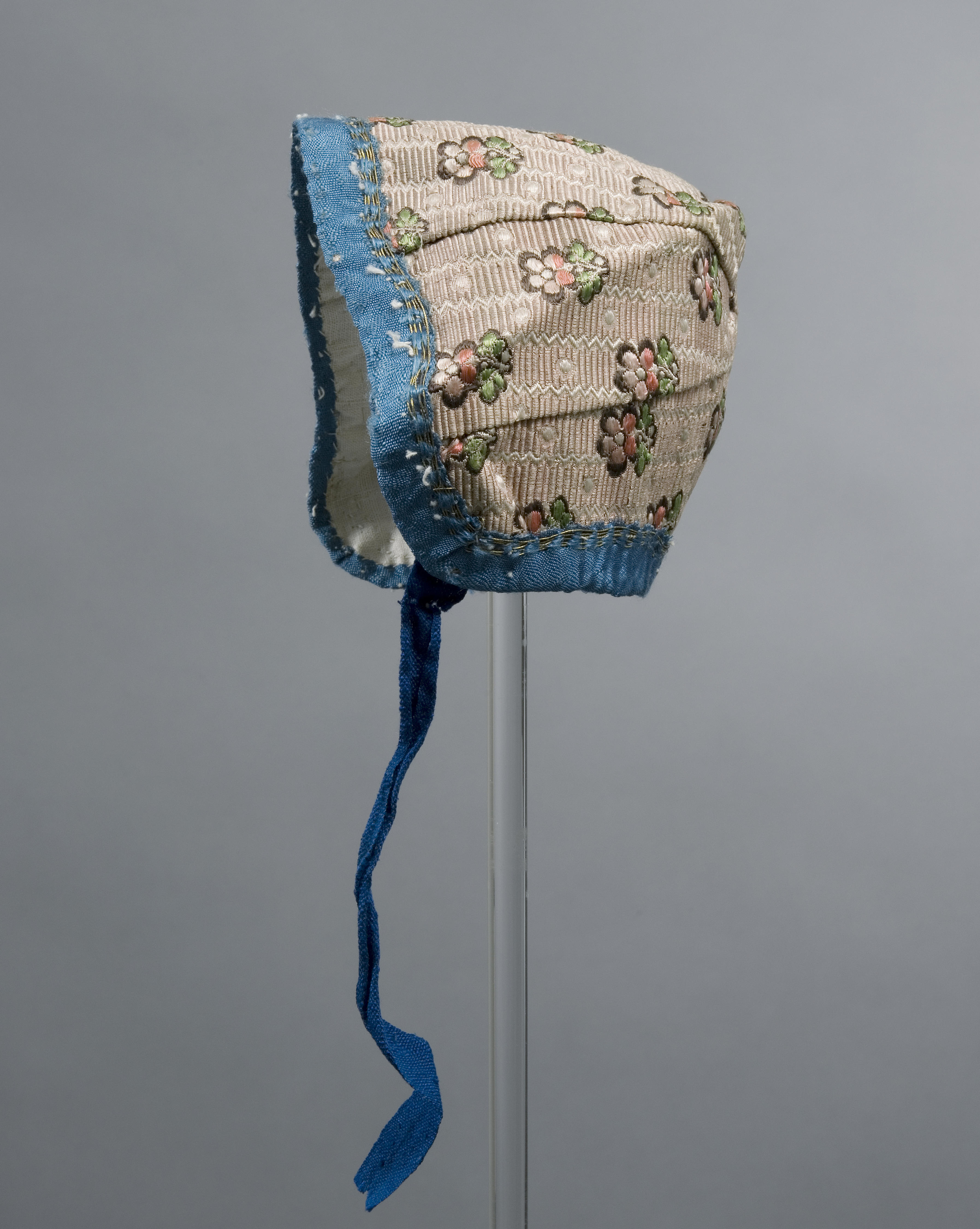 Jongensmuts uit Arnemuiden, bestaande uit zes straalsgewijze pandjes die gemaakt zijn van een gedessineerde zijde. De muts is gevoerd met katoen en rondom afgezet met een zijden bandje waarin gouddraad is verwerkt.