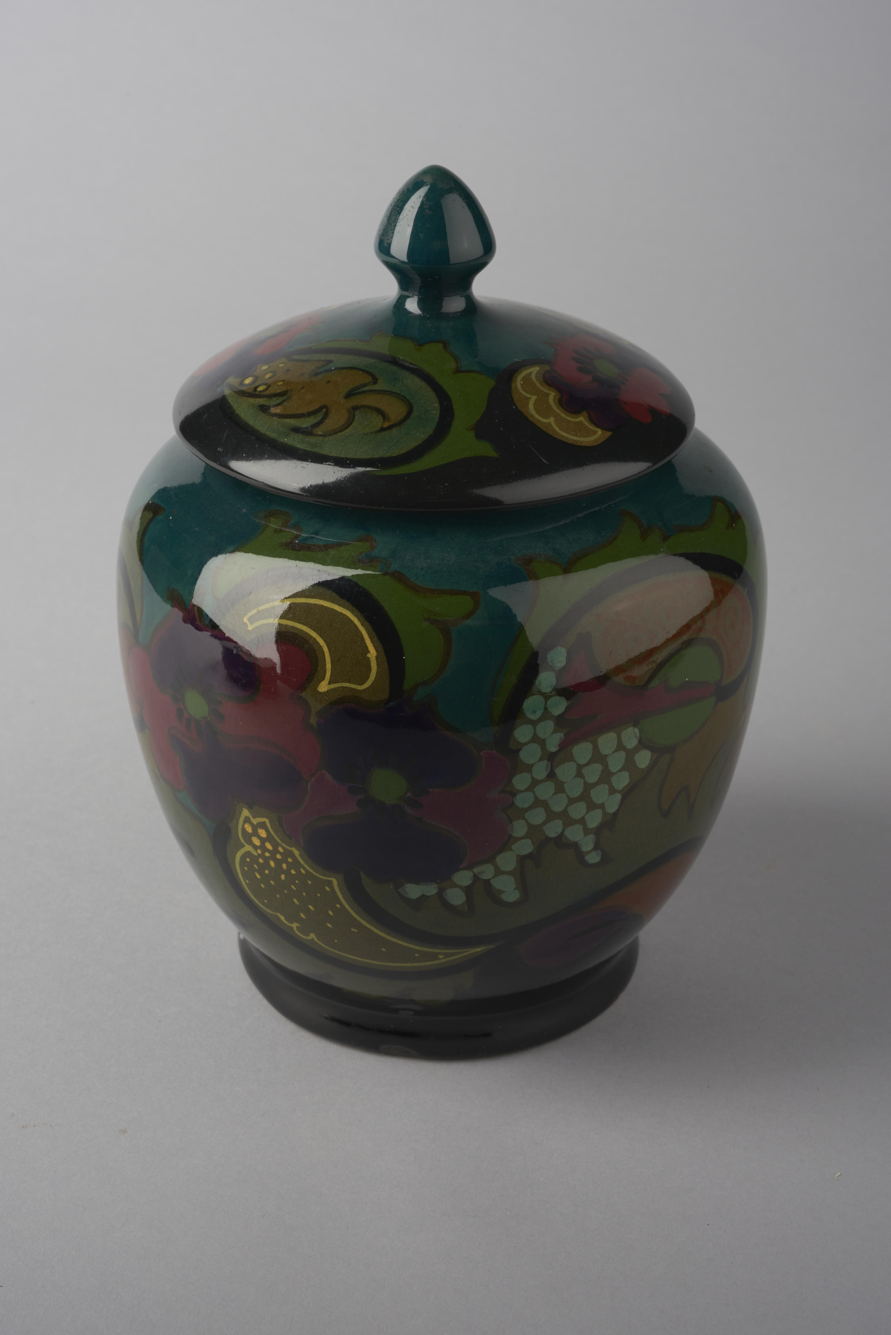 Aardwerken tabakspot met deksel. De pot en het deksel zijn beschilderd in de kleuren zwart, groen, blauw, geel, bruin, paars en roze.