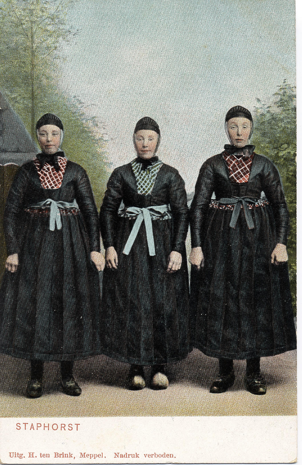 Drie vrouwen in Staphorster streekdracht. Ze zijn gekleed in opknapdracht voor de winter.