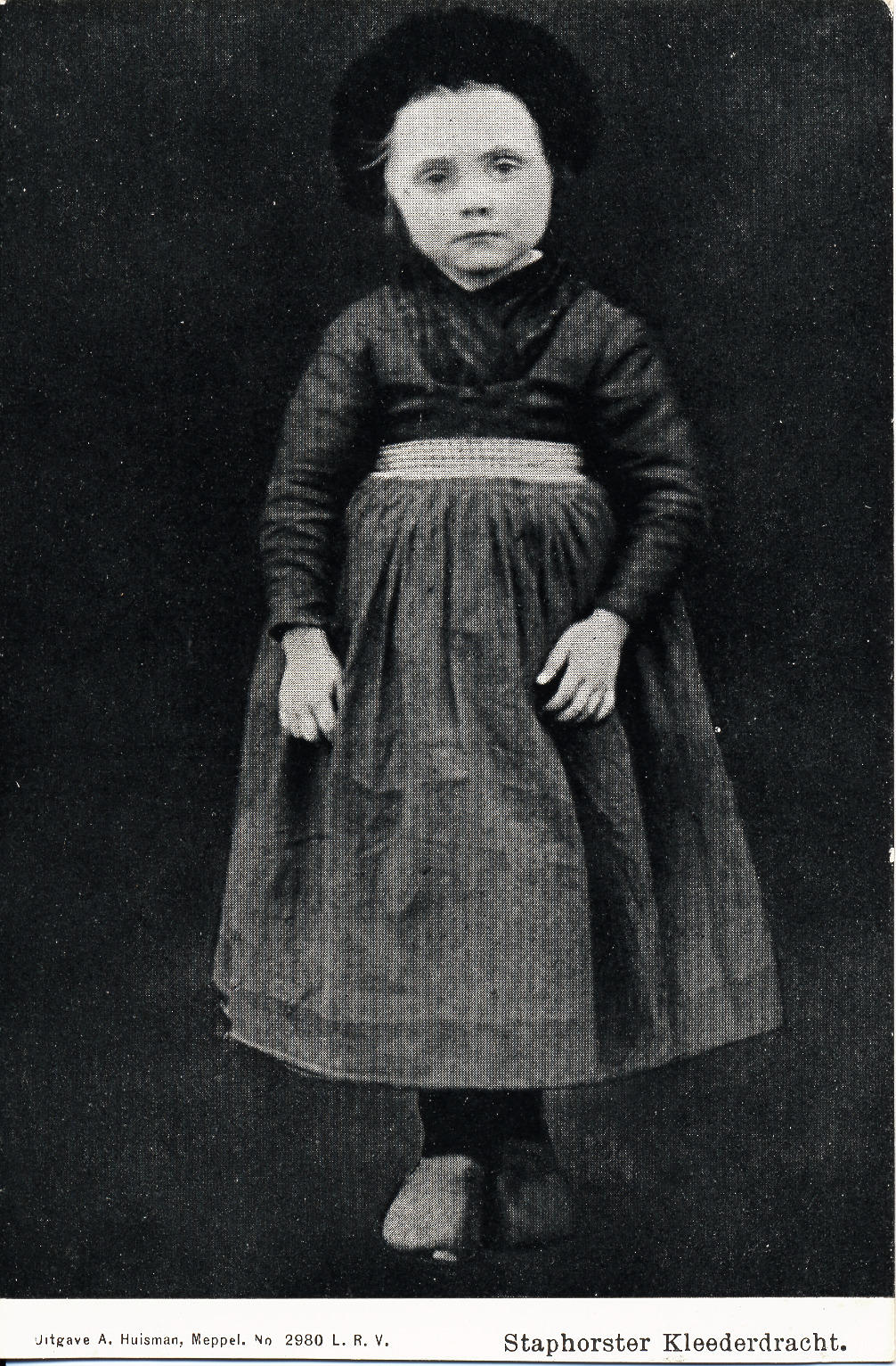 Femmigje Bloemert in Staphorster streekdracht. Op haar hoofd heeft ze een 'nette' (meisjesmuts). Over de geruite omslagdoek draagt ze het 'buisje' (winterjak) en verder een 'boordjesschort' en klompen.