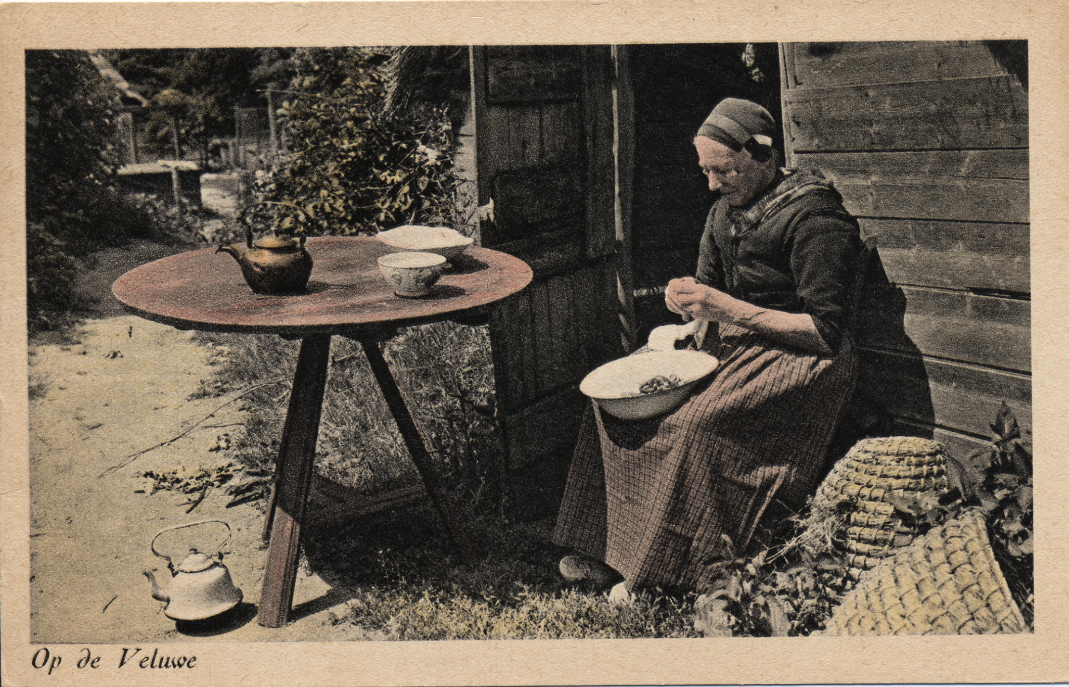 Gerritje de Bruin uit Vierhouten schilt aardappelen. Ze is gekleed in de streekdracht van de Noordwest-Veluwe en draagt de daagse dracht.