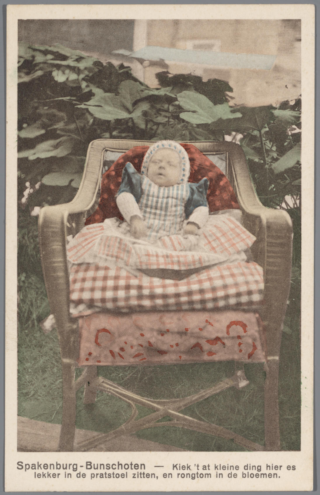 Kind in streekdracht uit Bunschoten-Spakenburg. Het kind draagt een zogenoemd dofmutsje op het hoofd.