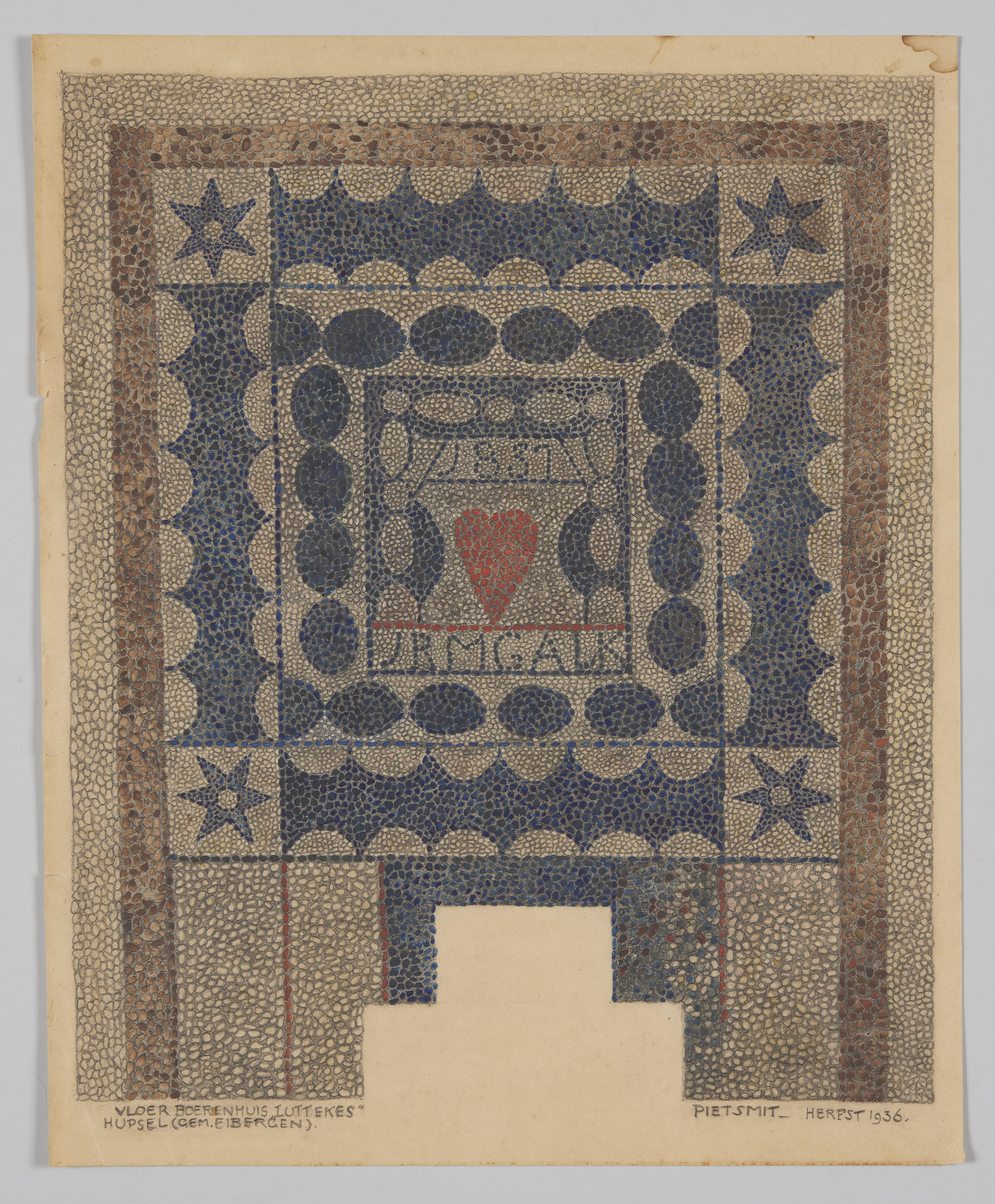 Een tekening van een zogenoemde keitjesvloer, afkomstig uit Hupsel bij Eibergen. In de vloer staan het jaartal 1837 en de initialen JRMGALK. Deze initialen zijn van het echtpaar Jan Rumate en Grada Aleida Luttekes uit Hupsel. De uitsparing aan de onderzijde is van de haardpartij. De keitjesvloer lag in het woongedeelte van de boerderij Erve ...