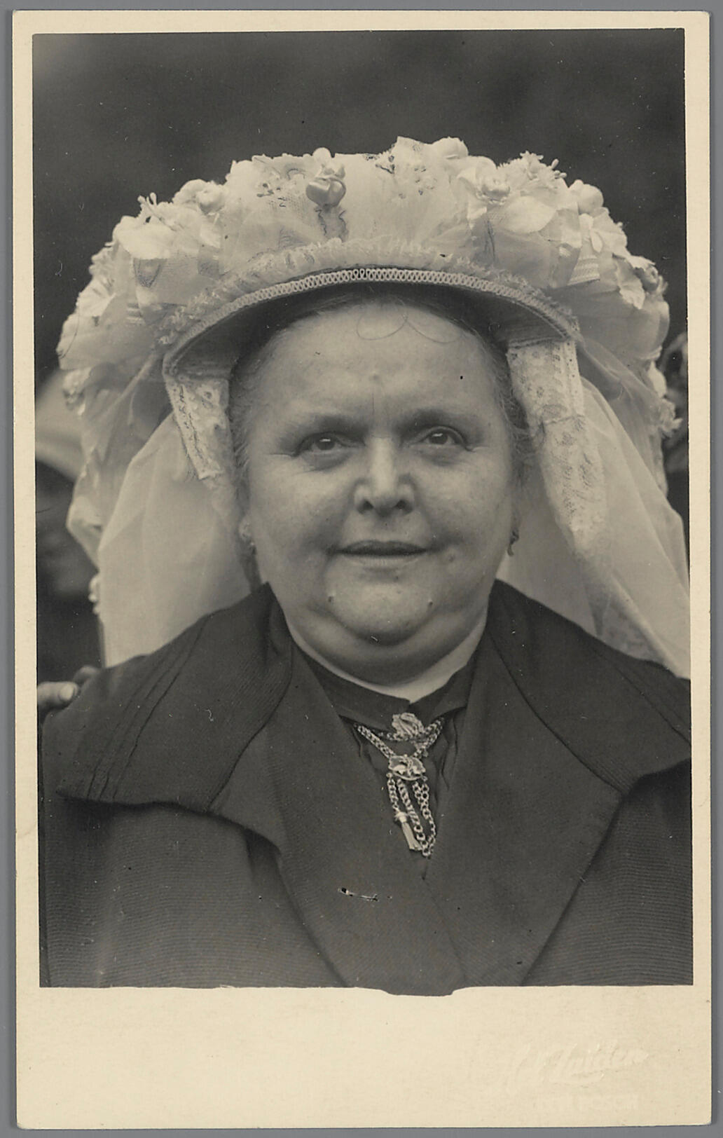 Vrouw in Brabantse streekdracht uit Neerkant in de Peel. Ze draagt over haar muts en ondermuts een ‘poffer’. Een poffer is een losse versiering van linten en kunstbloemen die op hoogtijdagen over de muts wordt gedragen.
