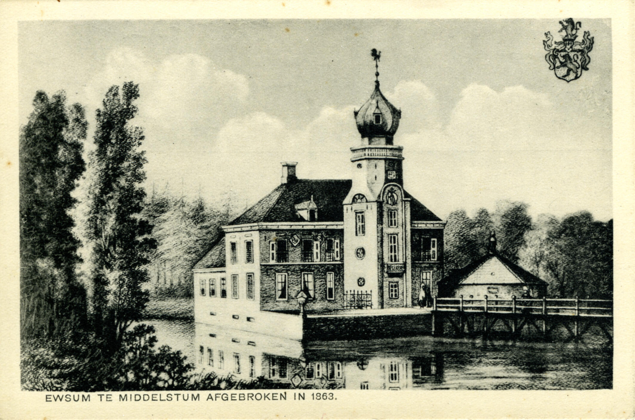 Ansichtkaart met een tekening van de borg Ewsum in Middelstum, afgebroken in 1863. Op de achterzijde van de ansichtkaart staat het rijmpje: 'Waarom altijd van Oost en West, De wonderen te malen; Van eigen dorp van eigen vest, Kan elk genoeg verhalen.'
