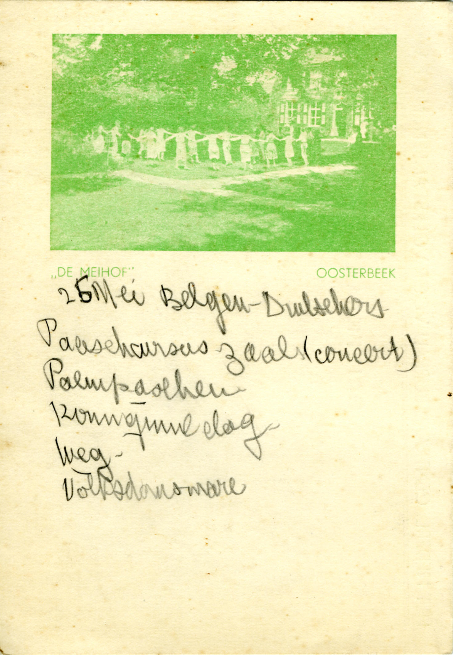 Ansichtkaart van De Meihof in Oosterbeek. Hier woonden de folklorist Dirk Jan van der Ven en zijn vrouw Elise van der Ven-ten Bensel. Op de afgedrukte foto wordt voor het huis gedanst. De kaart is uitgegeven door het Nederlands Centraal Bureau voor Volksdansen in Oosterbeek. Het NCBV werd in 1932 opgericht door mevrouw Van der ...